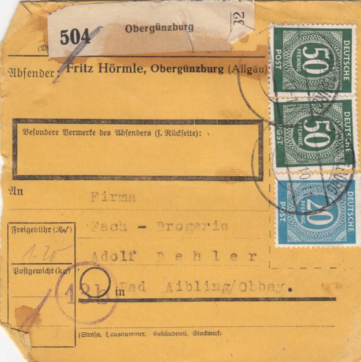 Carte de paquet 1947: Obergünzburg vers Bad Aibling, Auto-booker