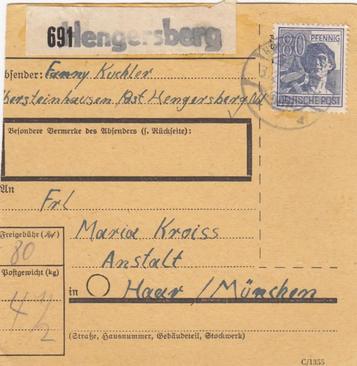 Carte de paquet 1947: Obersteinhausen via Post Hengersberg vers Haar, établissement