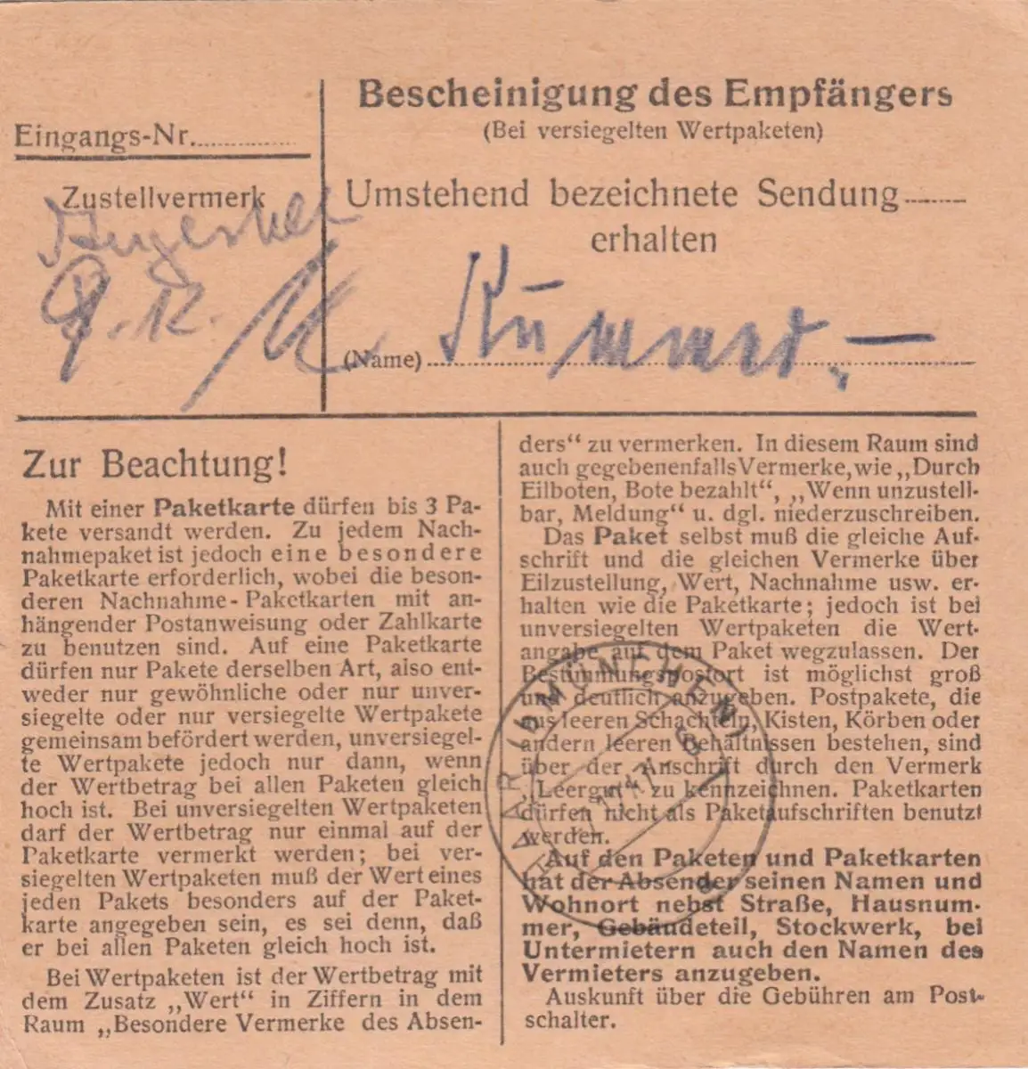 Carte de paquet 1947: Olching par cheveux, bureau d'achat, carte de valeur