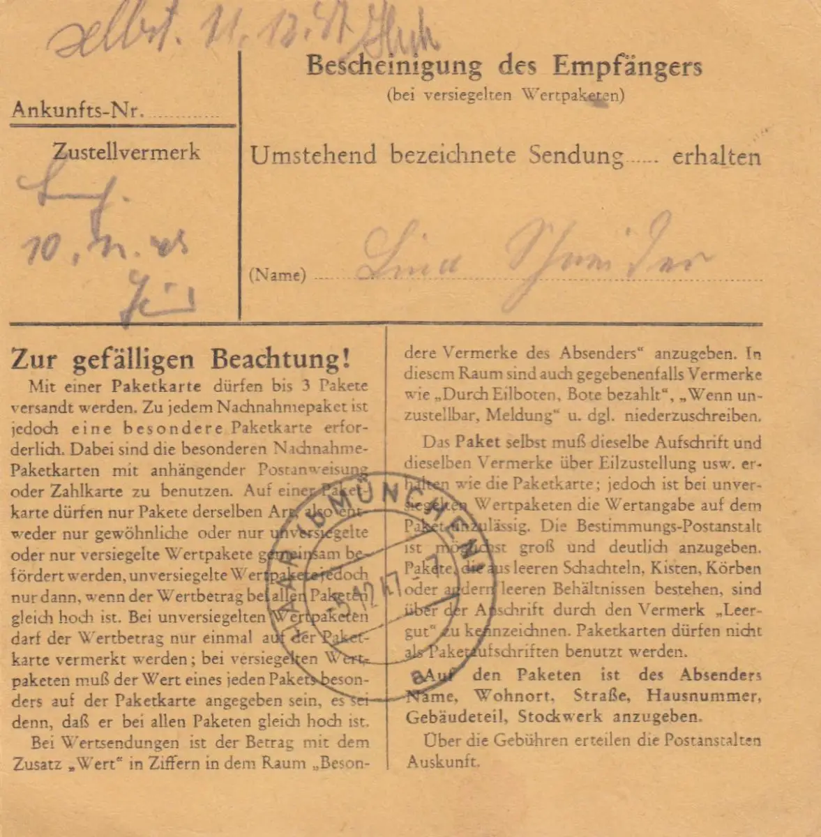 Carte de paquet 1947: Post Lieraching, Deggendorf par Haar