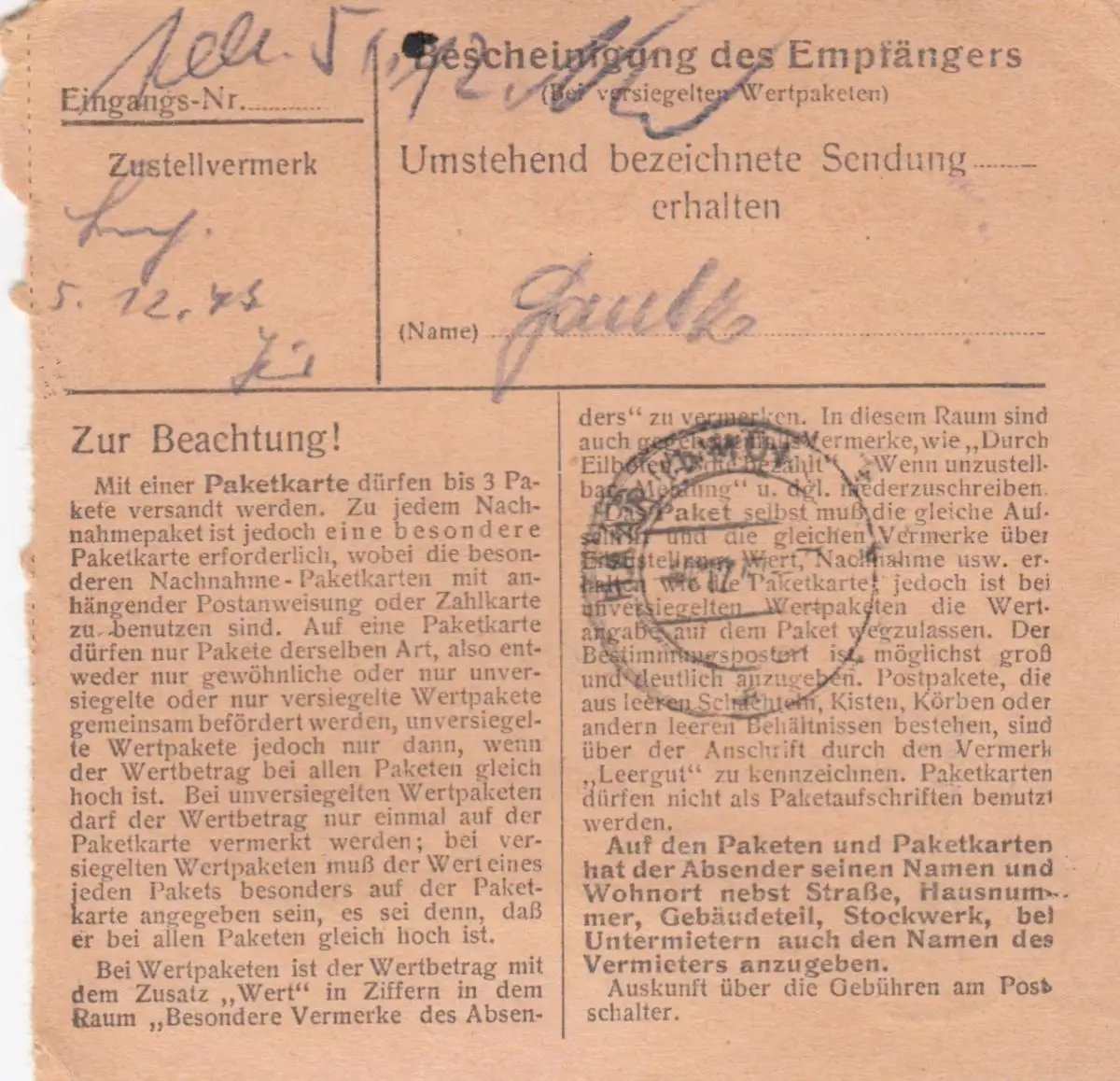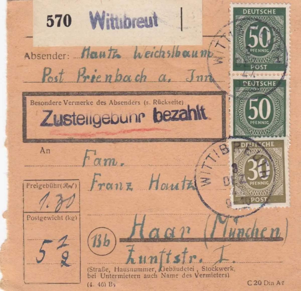 Carte de paquet 1947: Prienbach Wittibreut par Haar