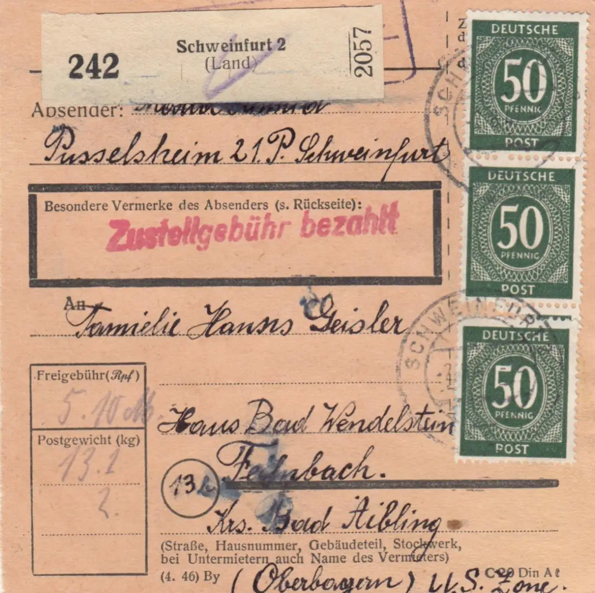 Carte de paquet 1947: Pusselsheim Post Schweinfurt vers Feilnbach