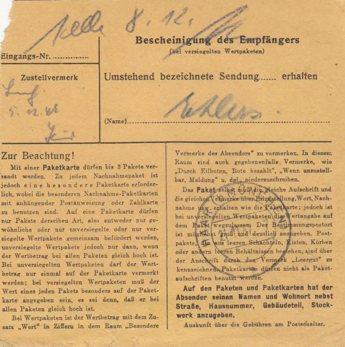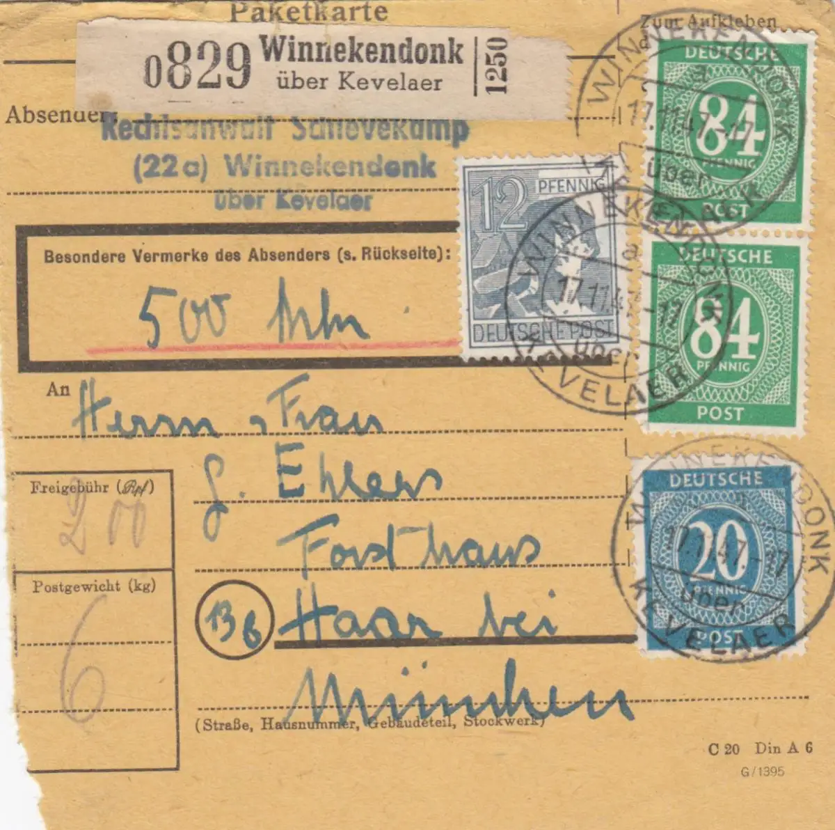 Carte de paquet 1947: avocat, Winnekendonk par cheveux, carte de valeur