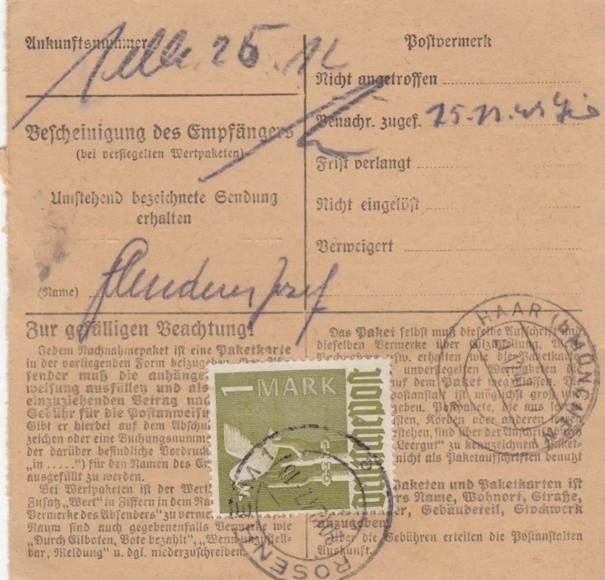 Carte de paquet 1947: Rosenheim par cheveux, réduction