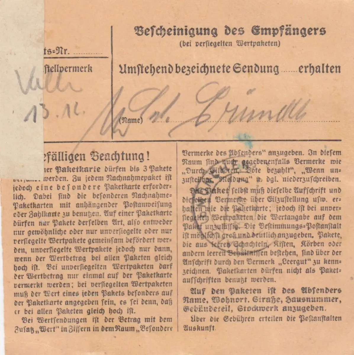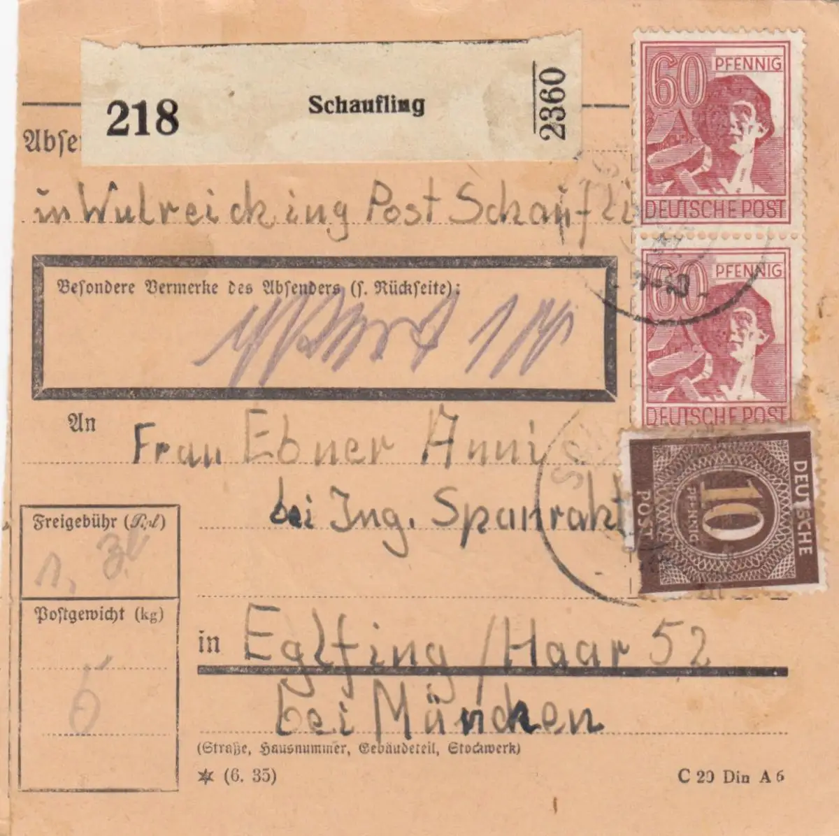 Carte de paquet 1947: Schaufling in Wulreiching apr. Eglfing - Valeur