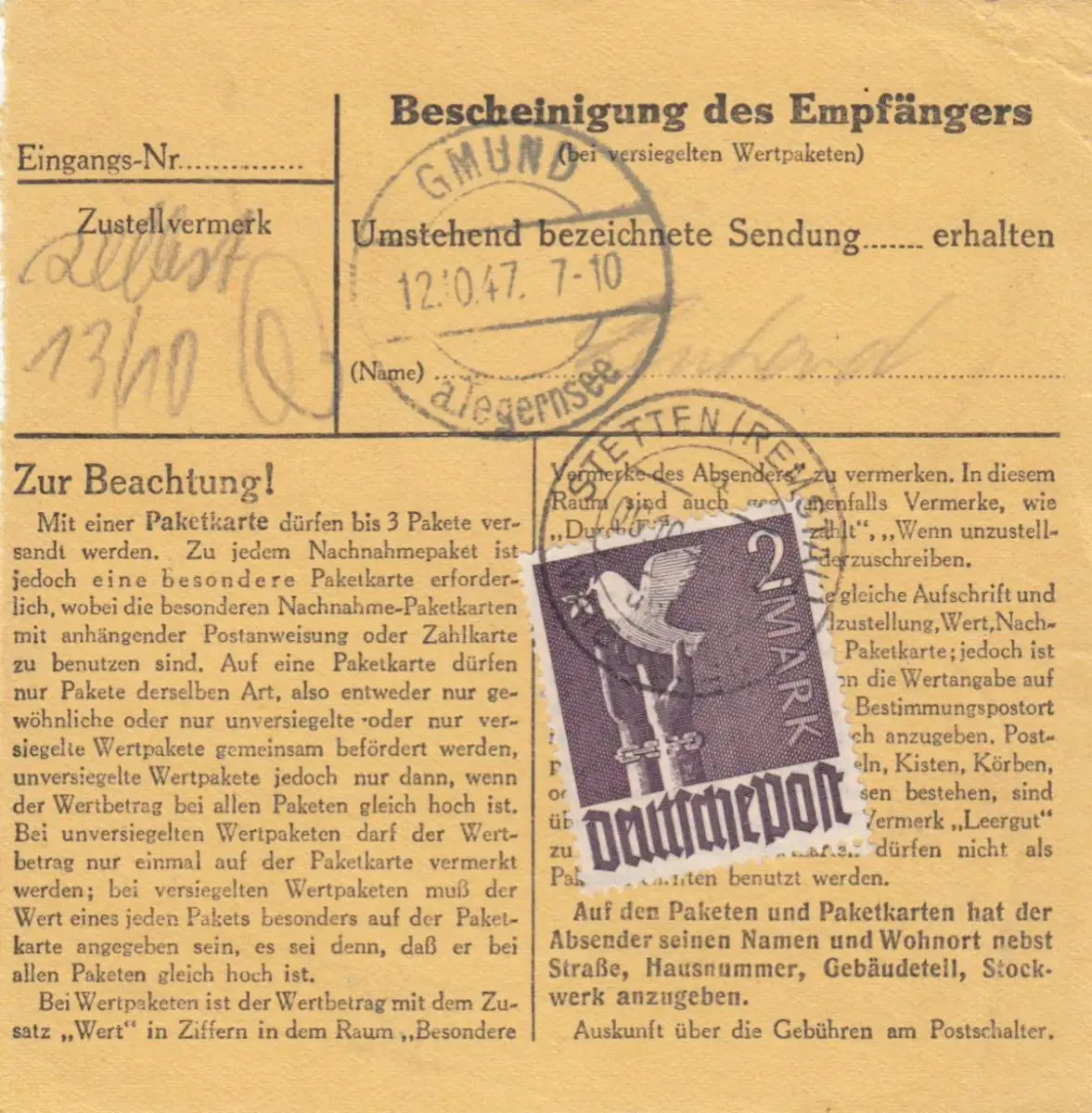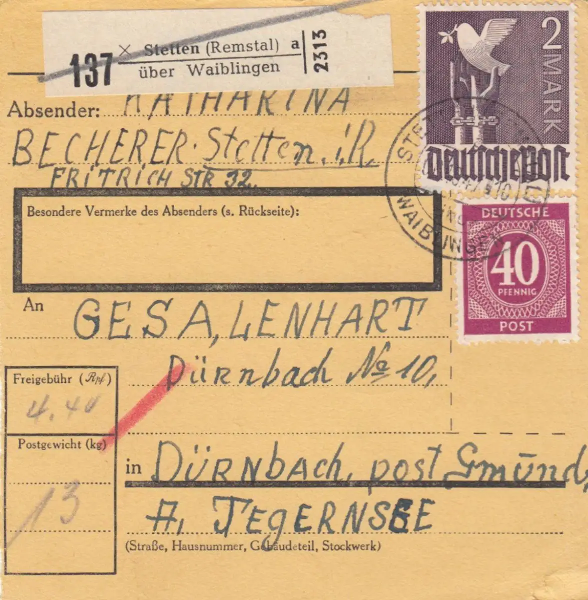 Carte de paquet 1947: Stetten Remstal d'après Dürnbach