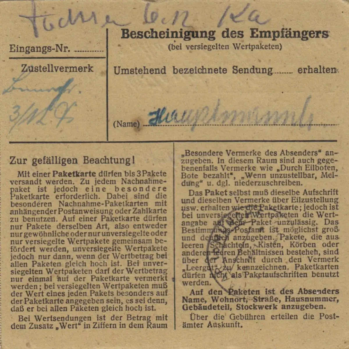 Carte de paquet 1947: Stuttgart-Fützbach vers Ottendichl