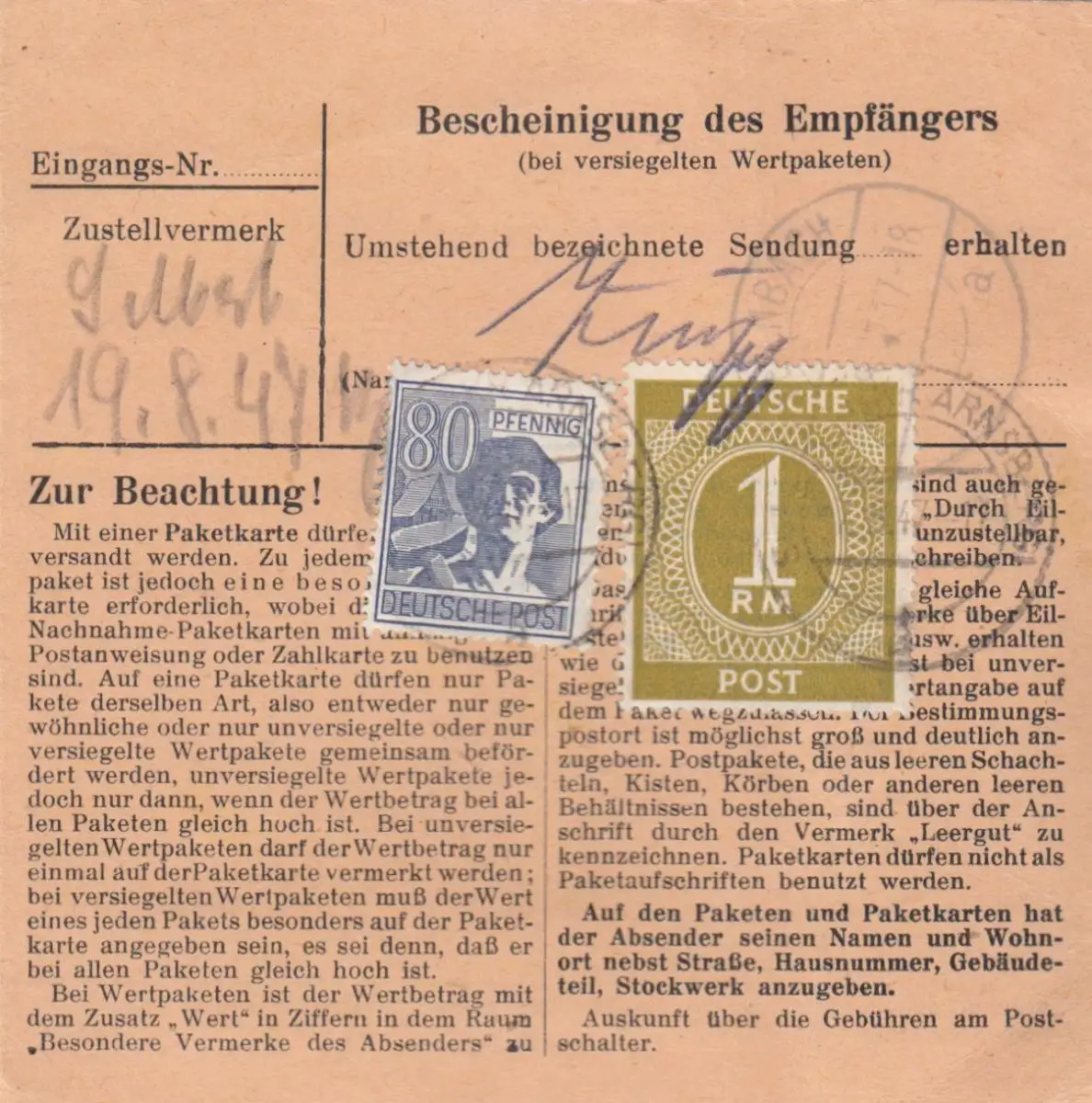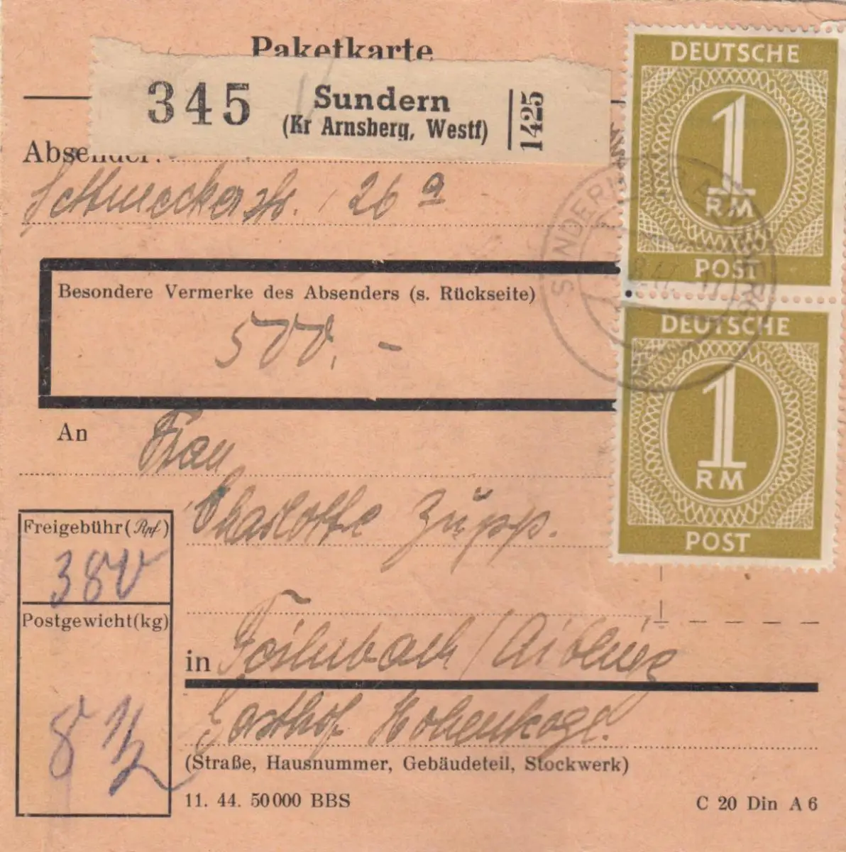 Carte de paquet 1947: Sundern vers Feilnbach, Gasthof, carte de valeur