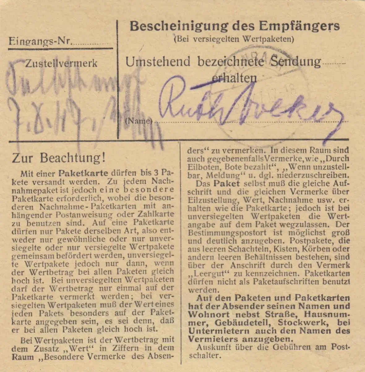 Carte de paquet 1947: Tegernsee vers Feilnbach, carte de valeur
