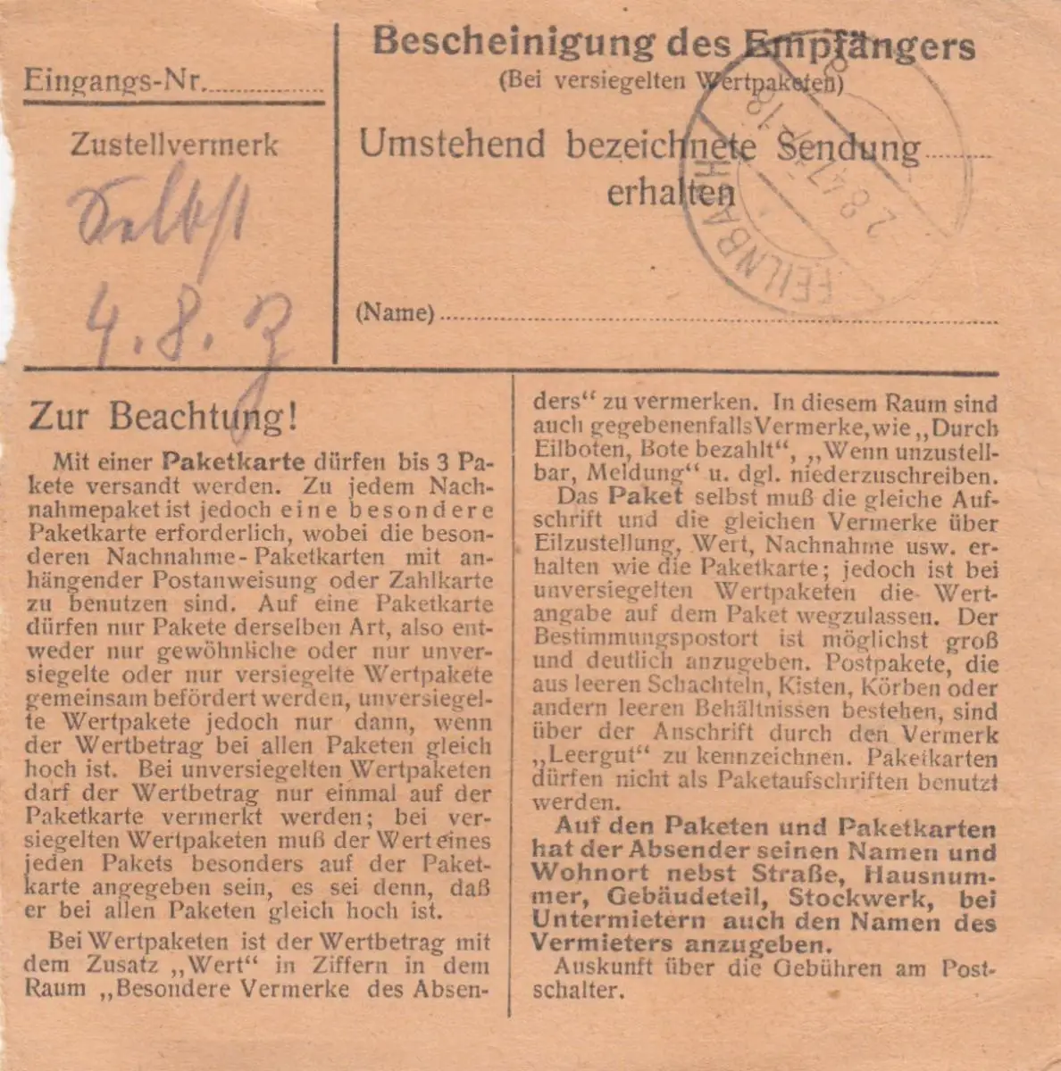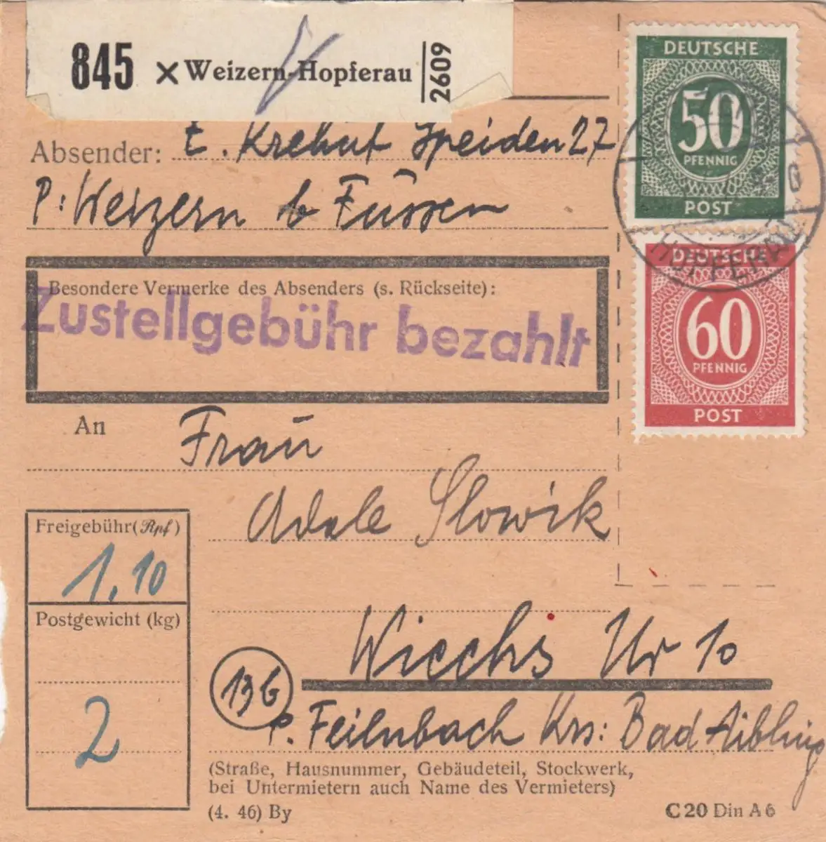 Carte de paquet 1947: Weizern-Hebrettau vers Wiechs, Feilnbach