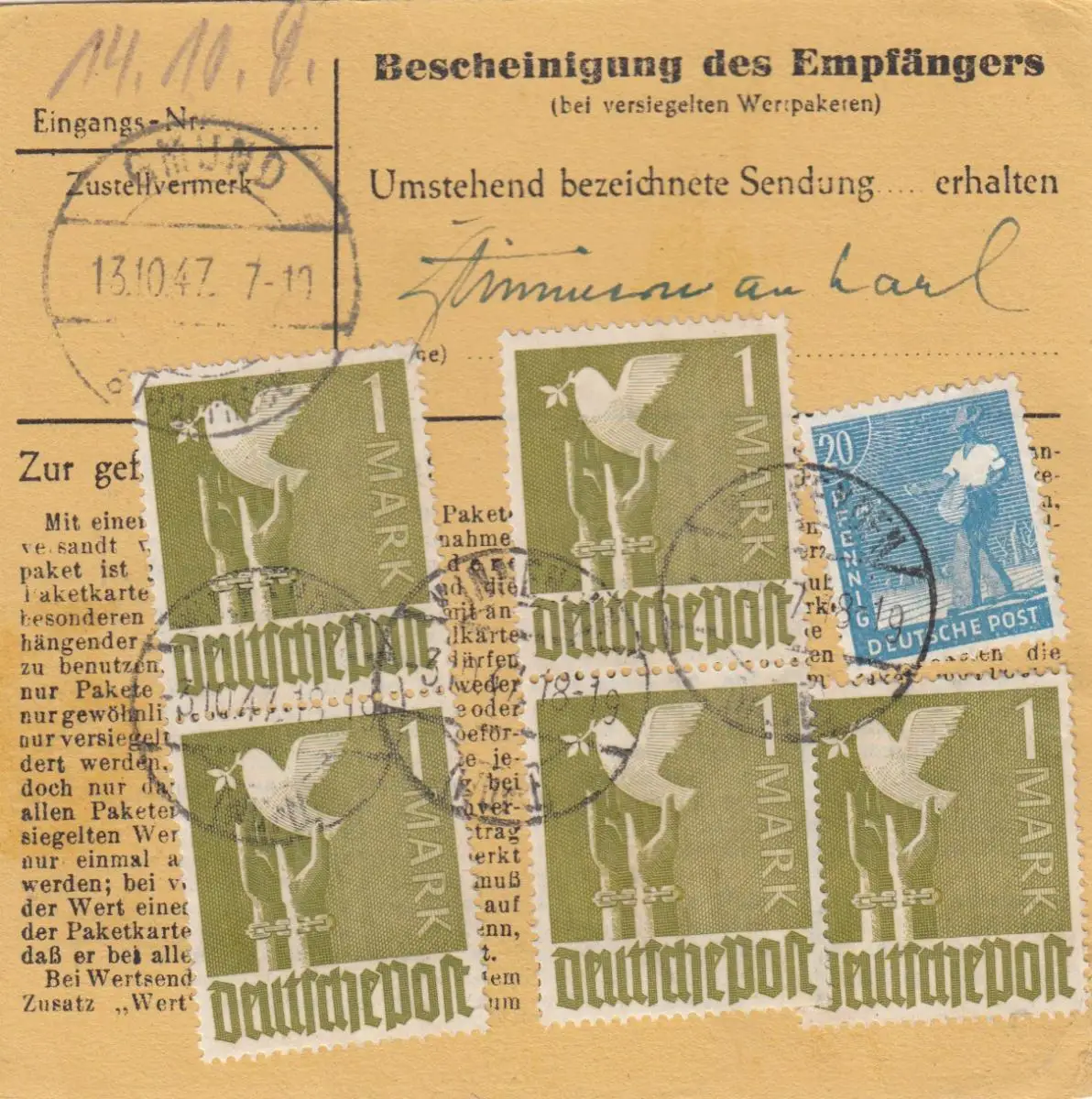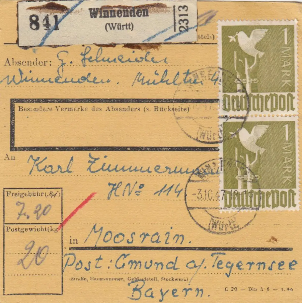 Carte de paquet 1947: Winnenden Württ. vers Moosrain Post Gmund