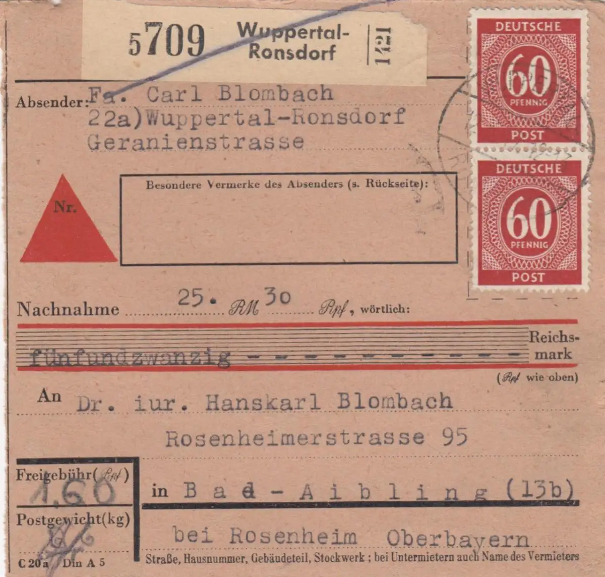 Carte de paquet 1947: Wuppertal-Ronsdorf vers Bad Aibling, Acceptation