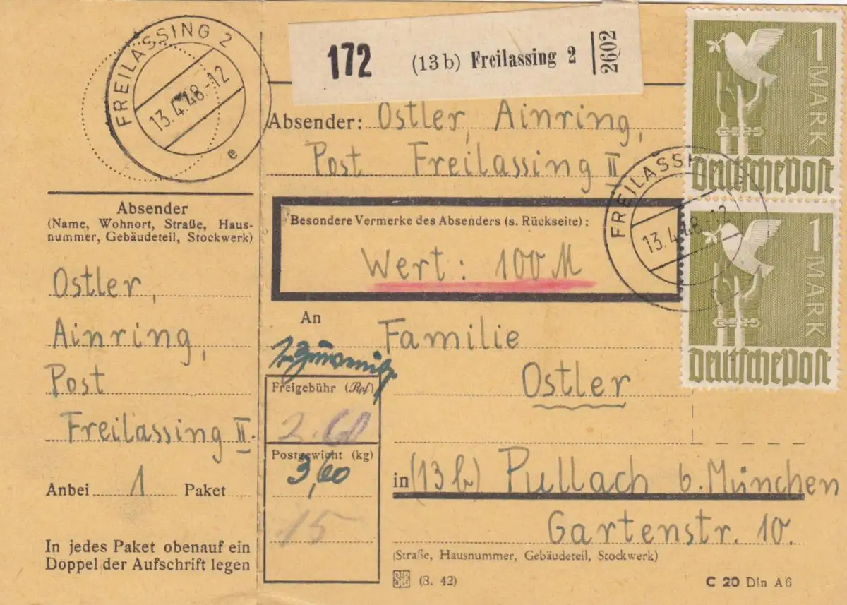 Carte de paquet 1948: Ainring vers Pullach, carte de valeur