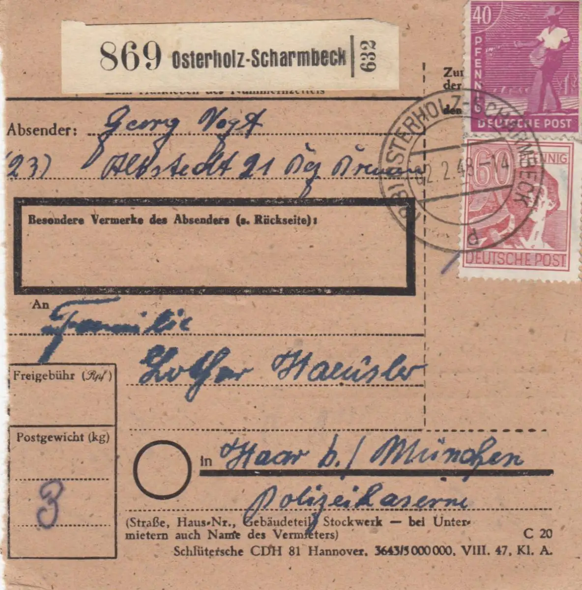 Carte de paquet 1948: Allstedt Osterholz-Scharmbeck selon les cheveux, caserne de police