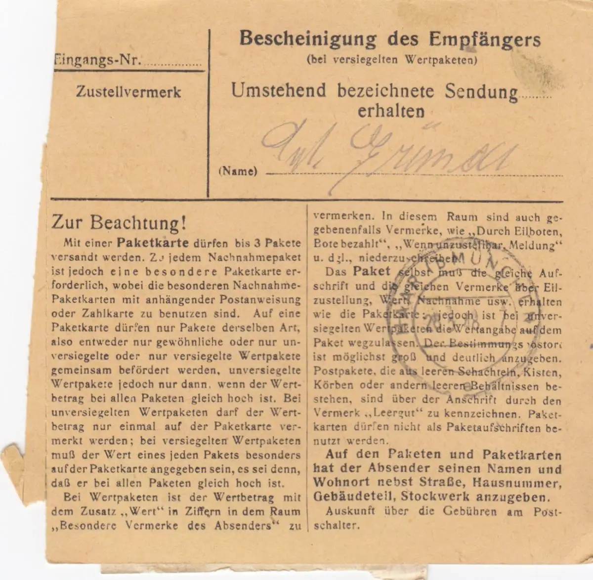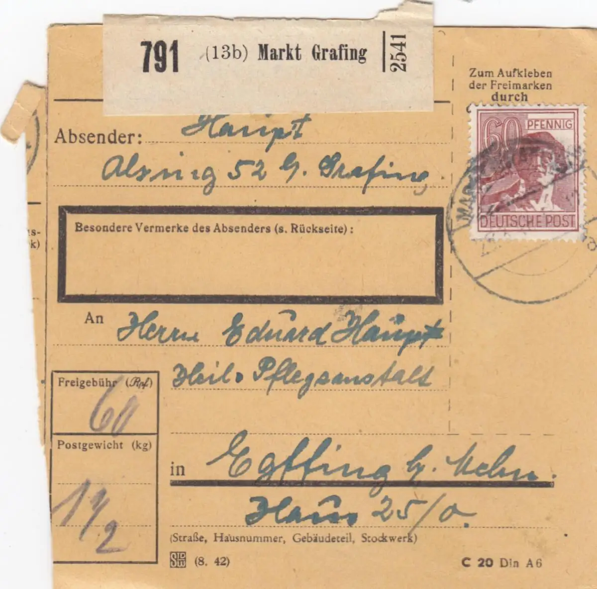 Carte de paquet 1948: Alxing Markt Grafing a Eglfings, Centre de cures