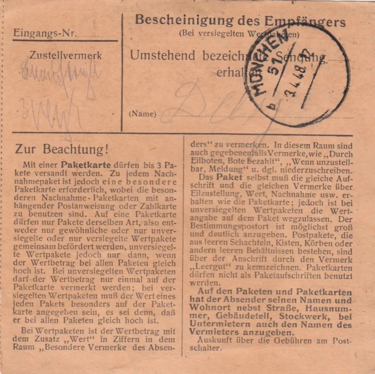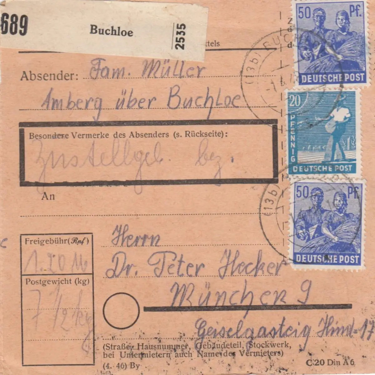 Carte de paquet 1948: Amberg Buchloe vers Munich
