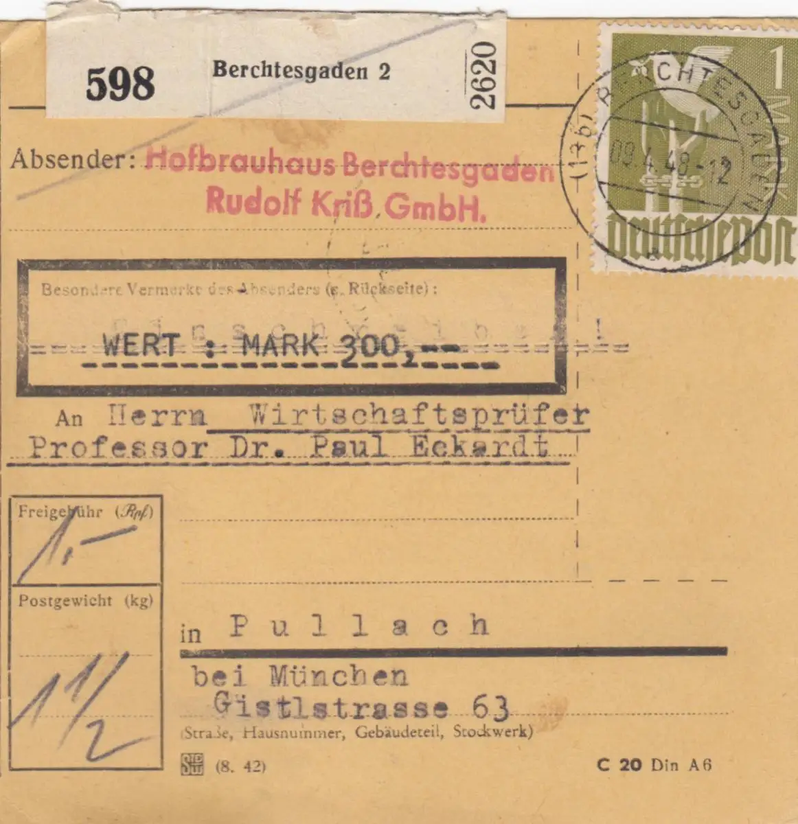 Carte de paquet 1948: Berchtesgaden après Pullach, carte de valeur