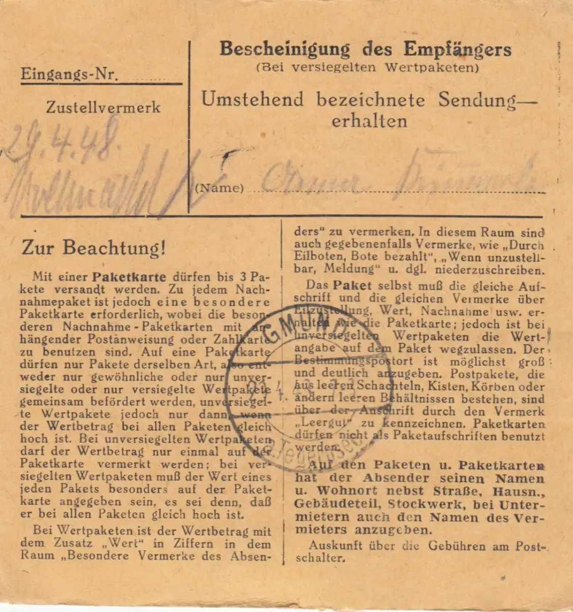 Carte de paquet 1948: Berg b. Starnberg d'après Dürnbach Gmund