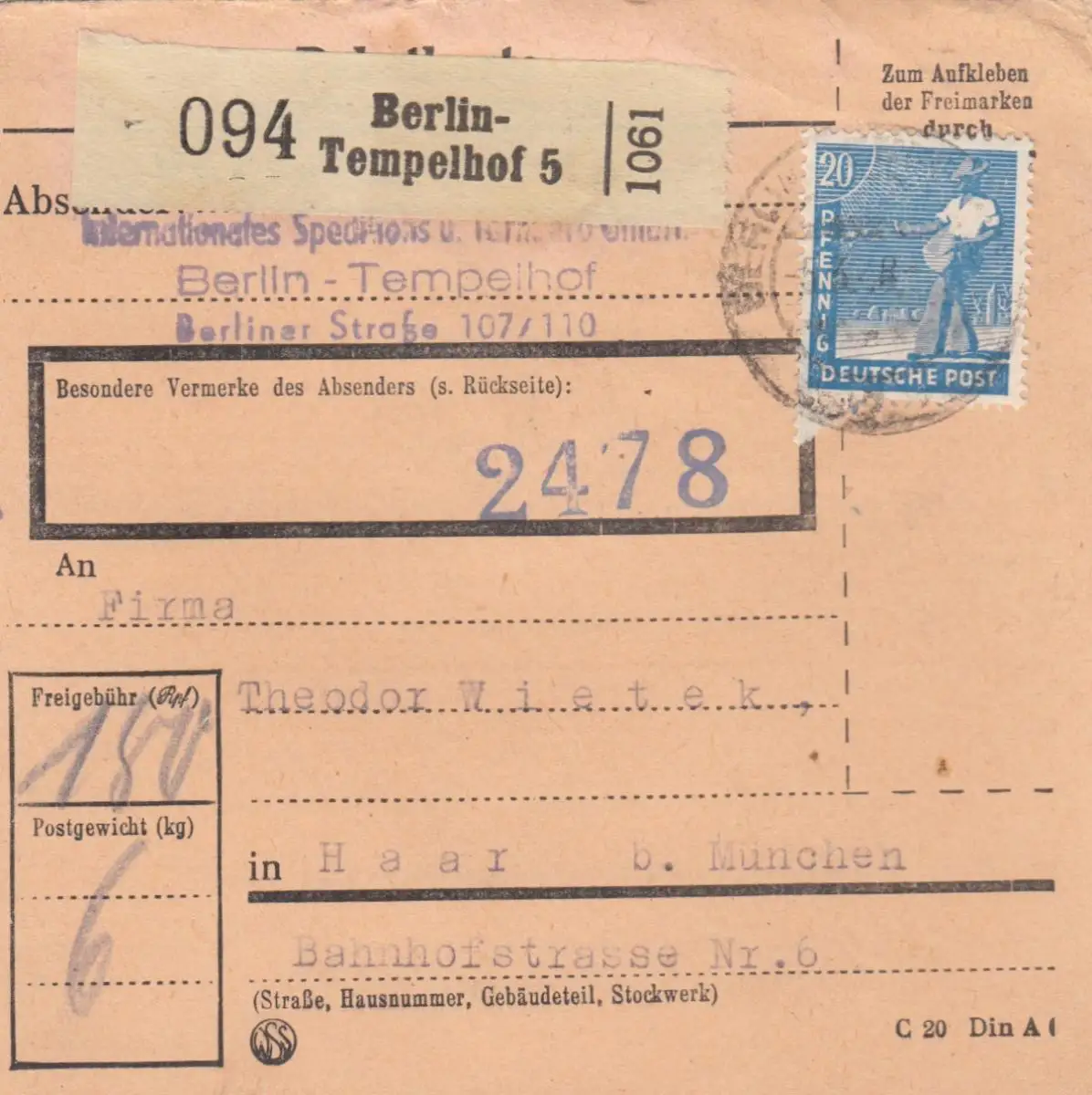 Carte de colis 1948: Berlin, Int. Spedition n. Haar, bes. Verm. 2478