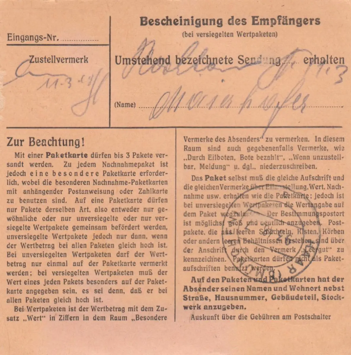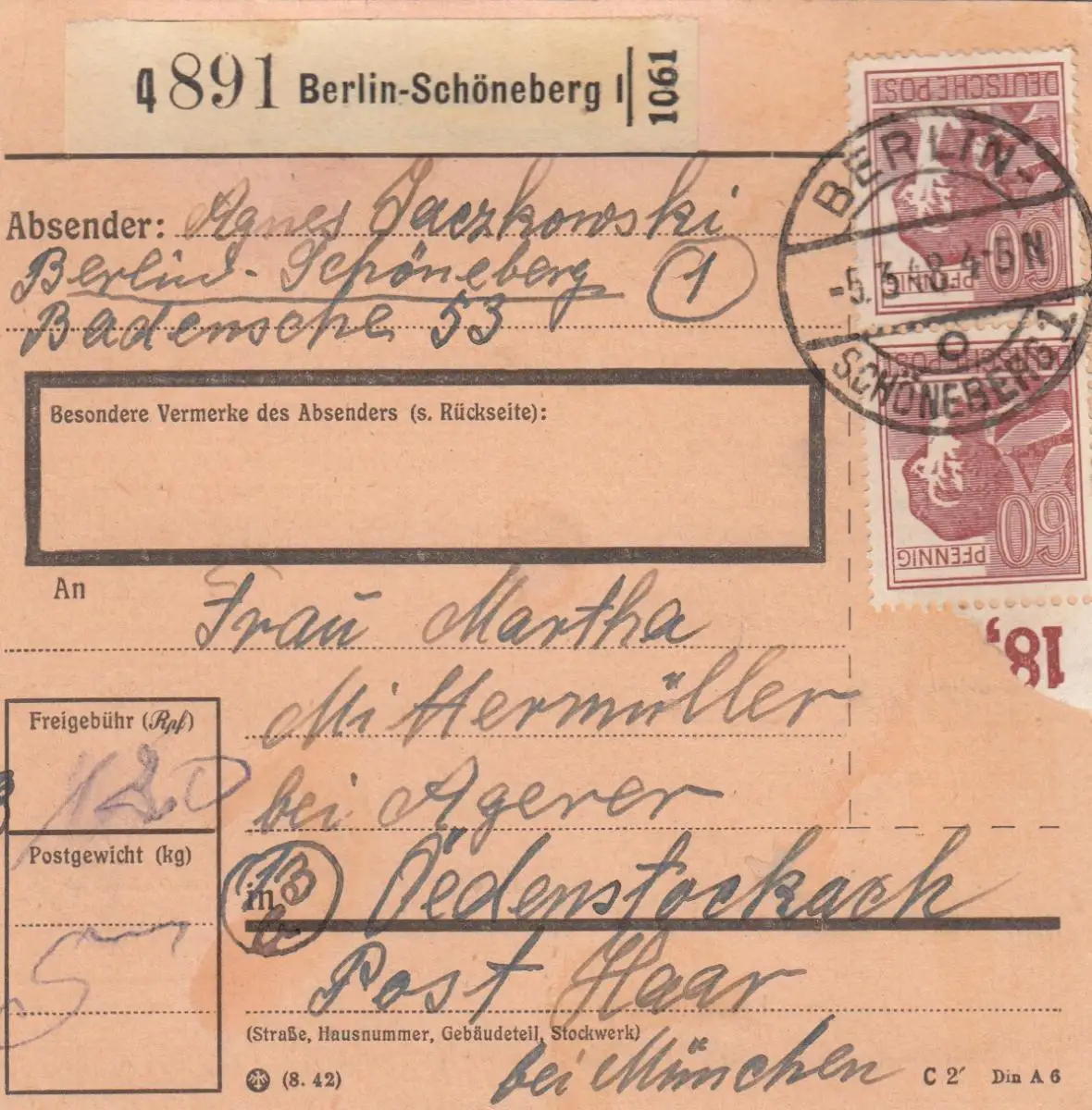 Carte de paquet 1948: Berlin-Schöneberg vers Oedenstockack, Post Haar