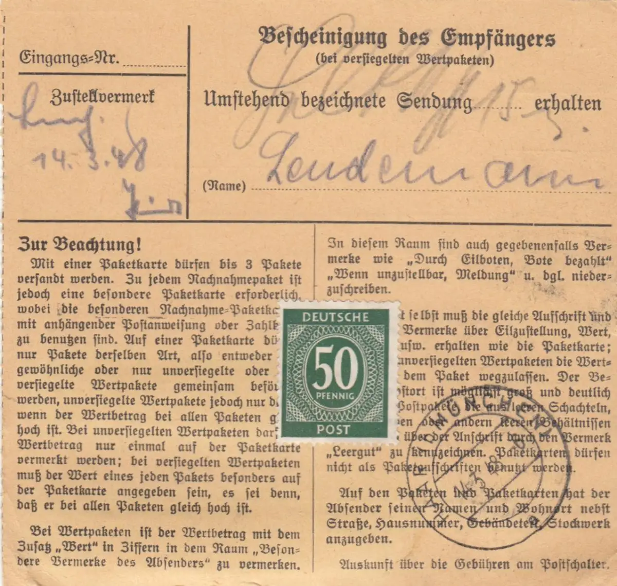 Carte de paquet 1948: Darmstadt par Haar, Urgent, Auto-bookeur