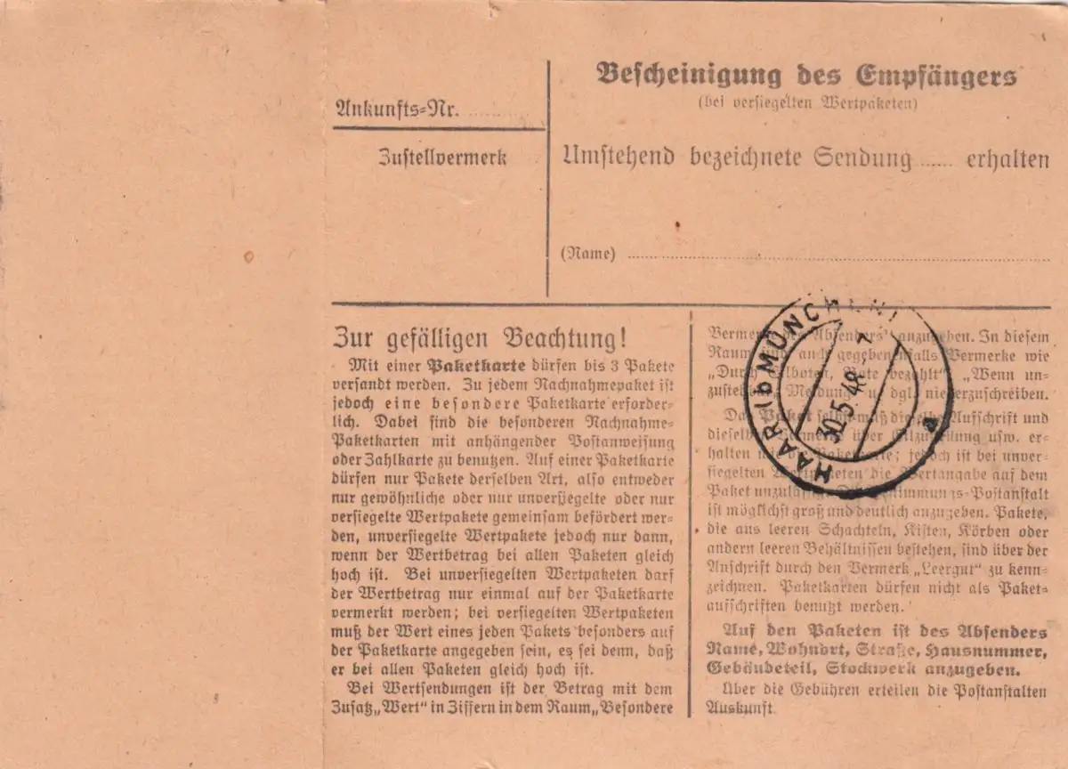 Carte de paquet 1948: Deisenhofen par cheveux, auto-réservation, carte de valeur