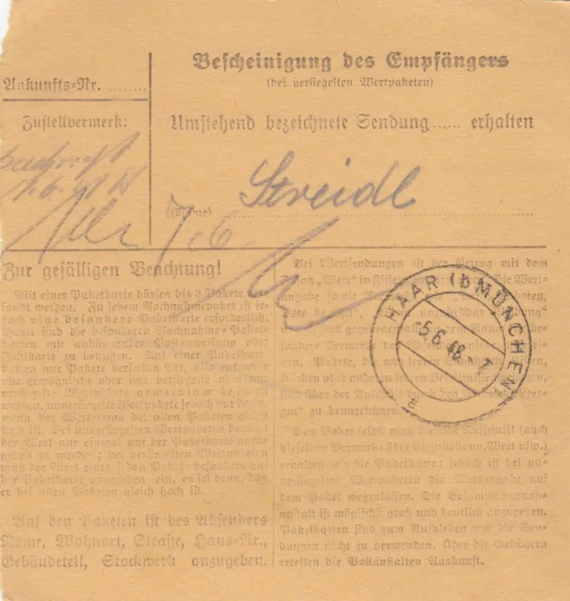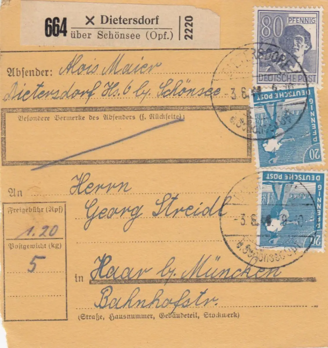 Carte de paquet 1948: Dietersdorf Schönsee a Haar bei Munich