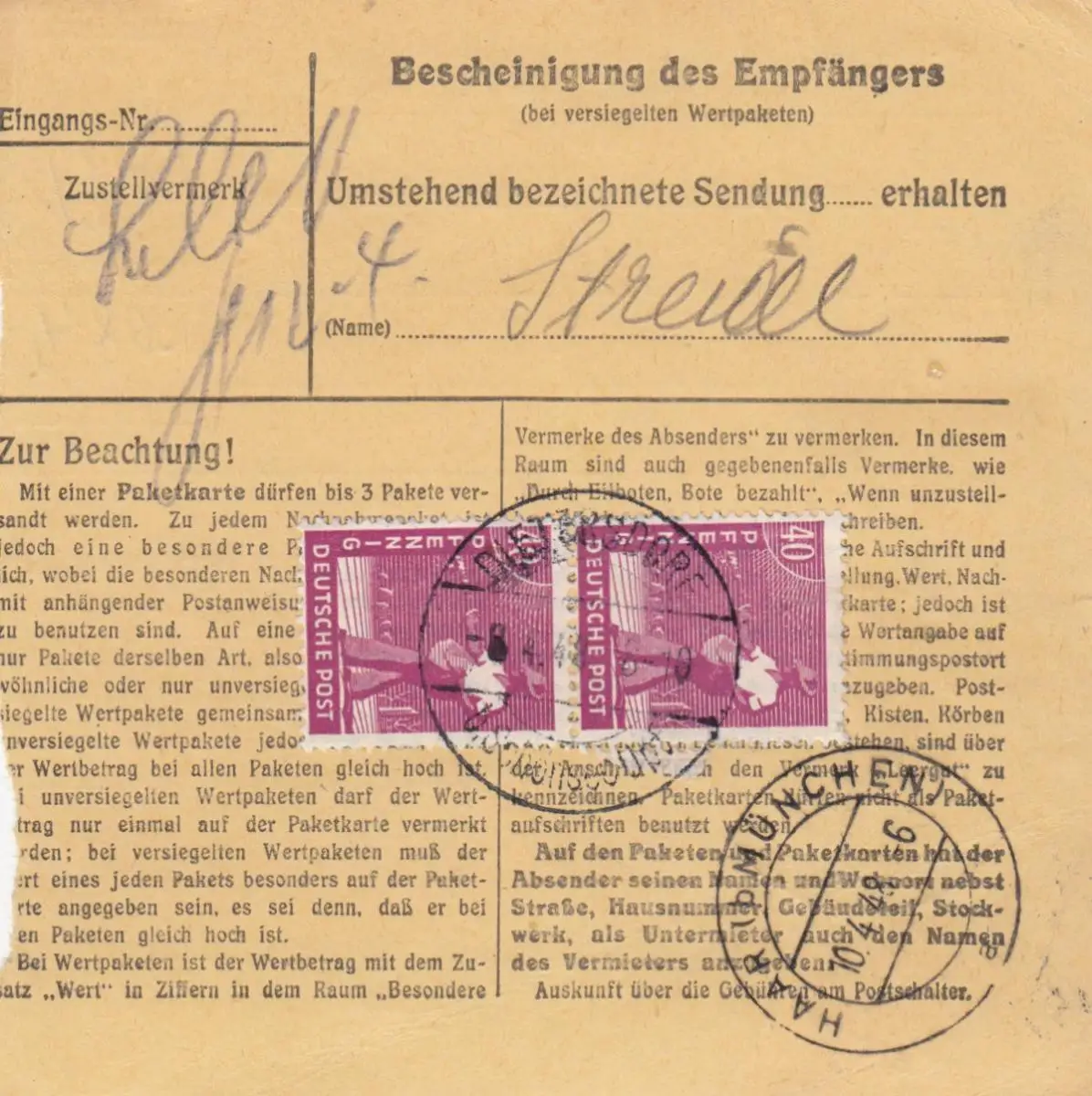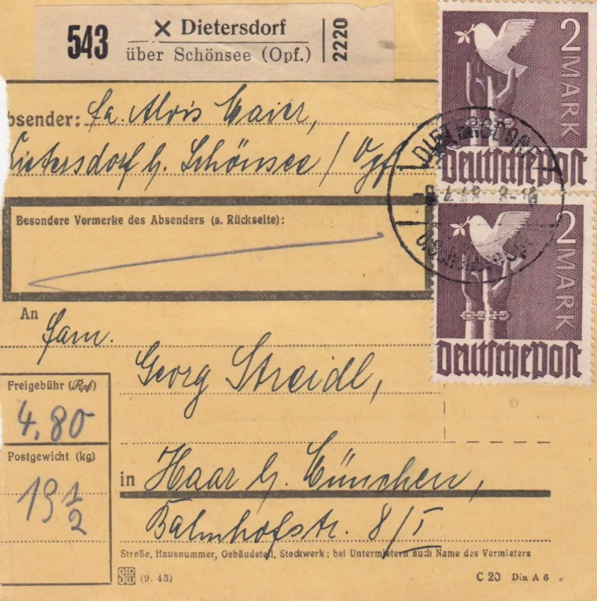Carte de paquet 1948: Dietersdorf sur Schönsee après Haar