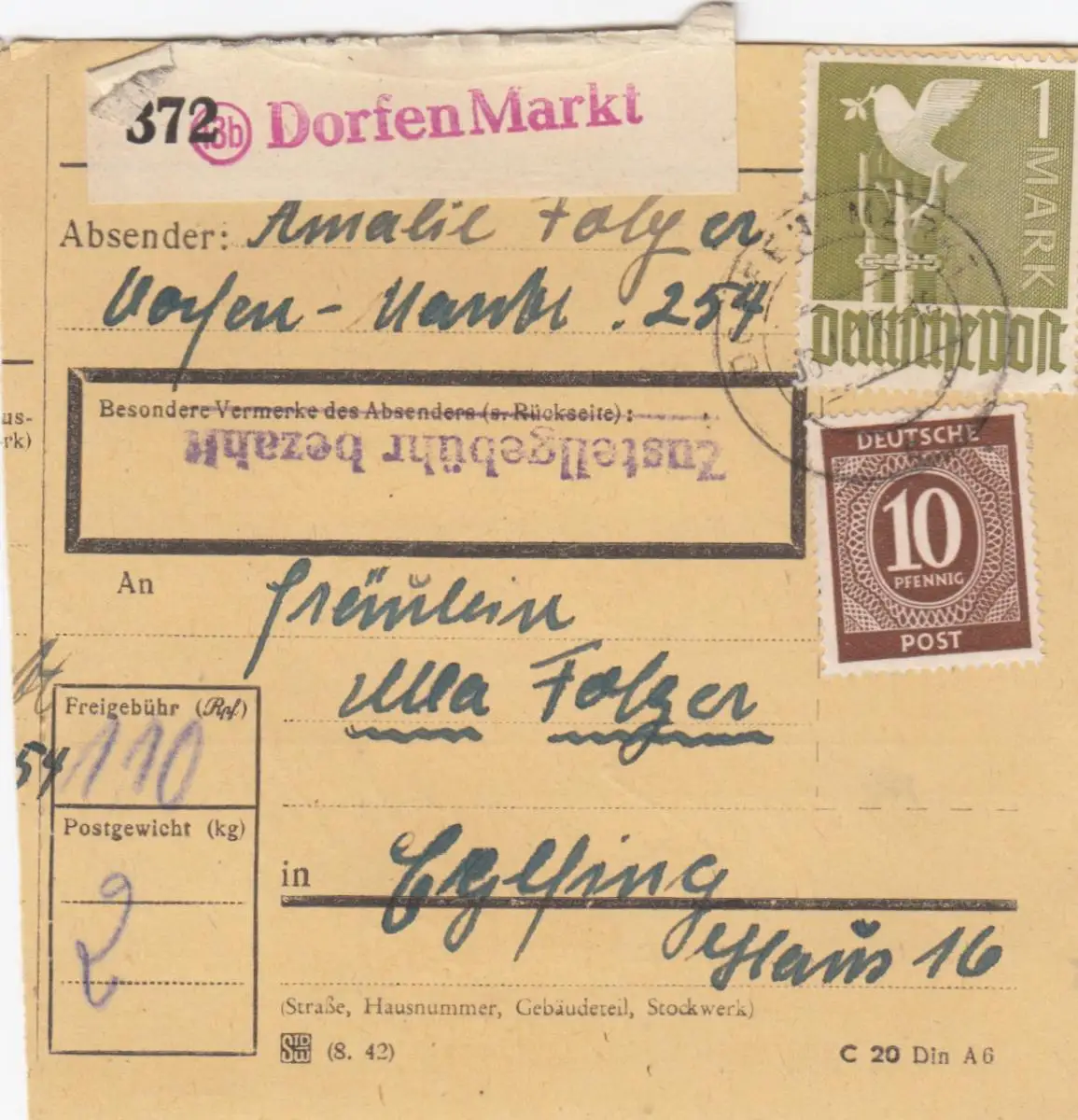 Carte de paquet 1948: Villages marché après Eglfing