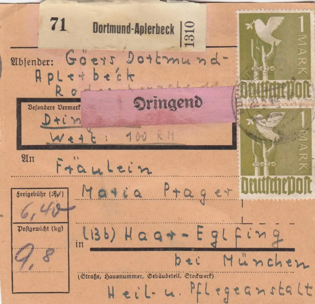 Carte de paquet 1948: Dortmund-Aplerbeck par cheveux, urgent, carte de valeur