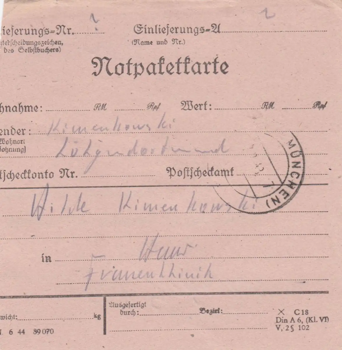 Carte de paquet 1948: Dortmund-Lütgendortmund à Munich, avec carte de colis d'urgence