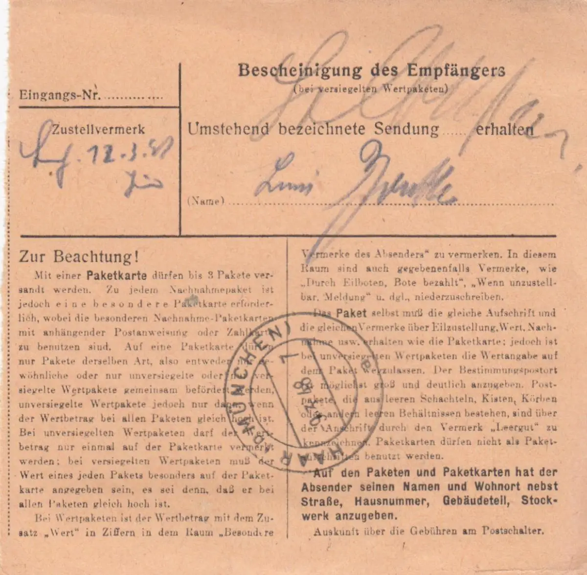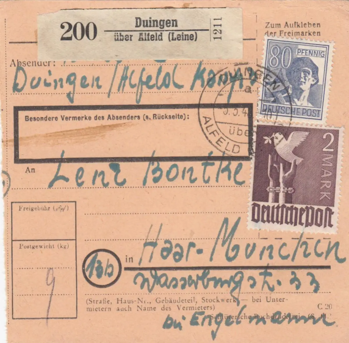 Carte de paquet 1948: Duingen sur Alfeld après les cheveux