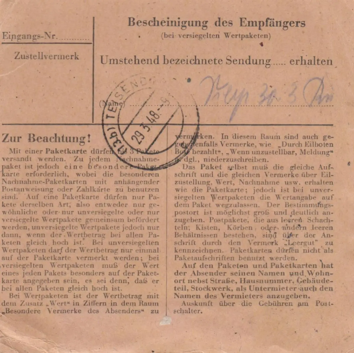 Carte de paquet 1948: Elbrinxen vers Teisendof