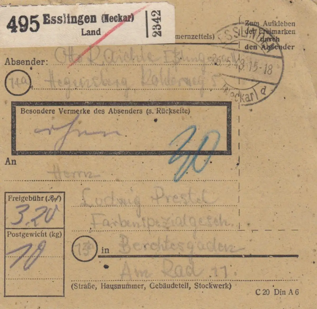 Carte de paquet 1948: Esslingen Hegensberg vers Berchtesgaden, frais supplémentaires