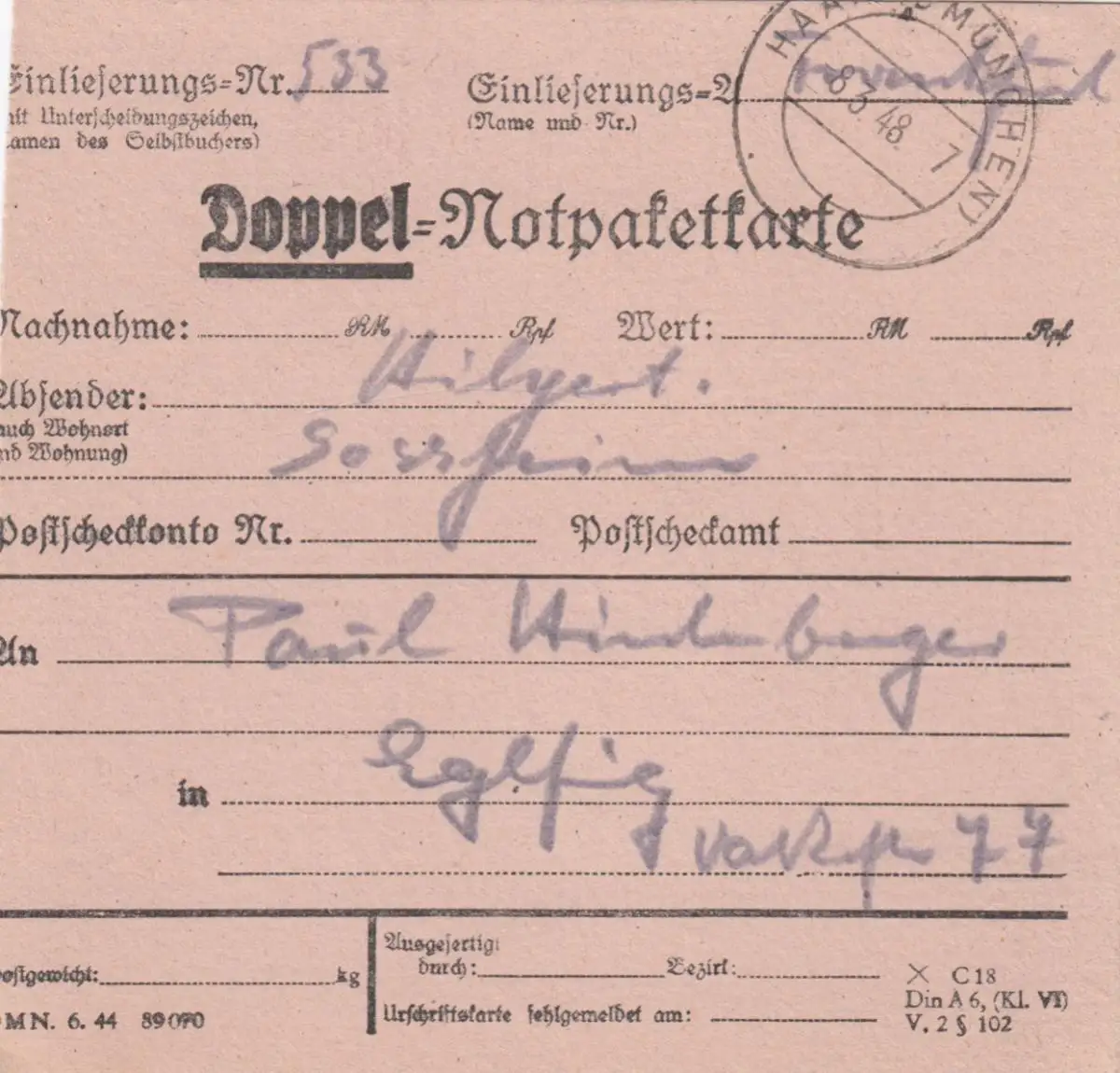 Carte de paquet 1948: Ffm. Sossenheim pour Eglfing, Urgent