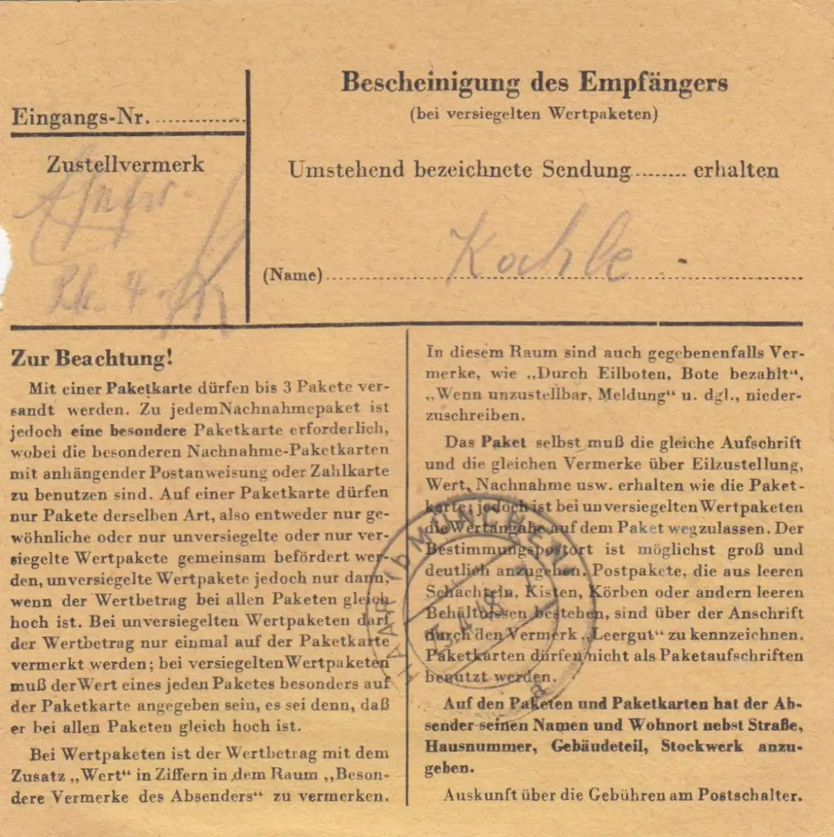 Carte de paquet 1948: Francfort après Haar