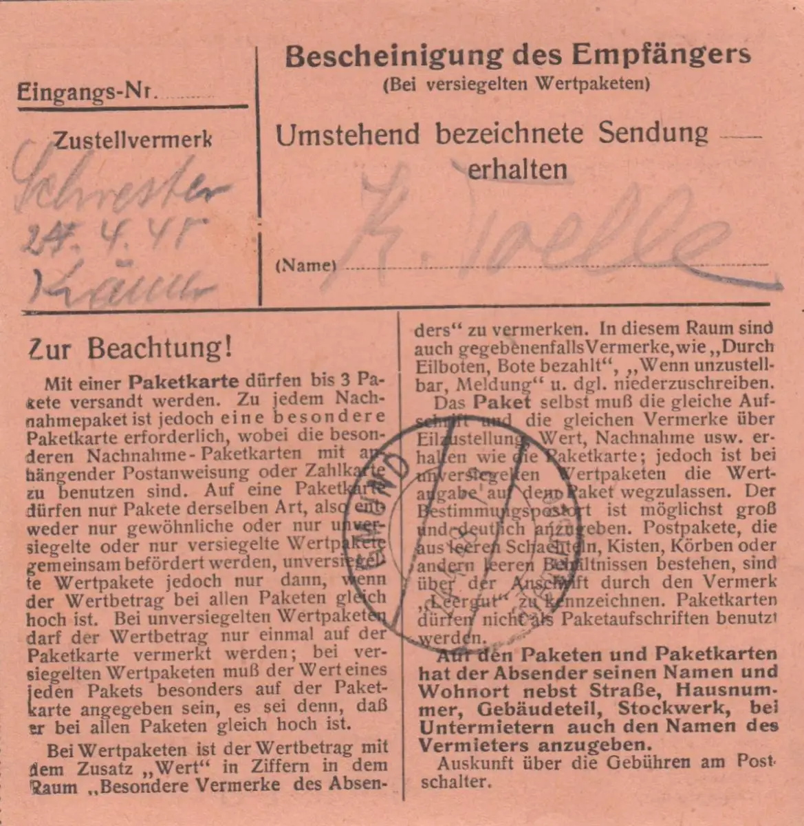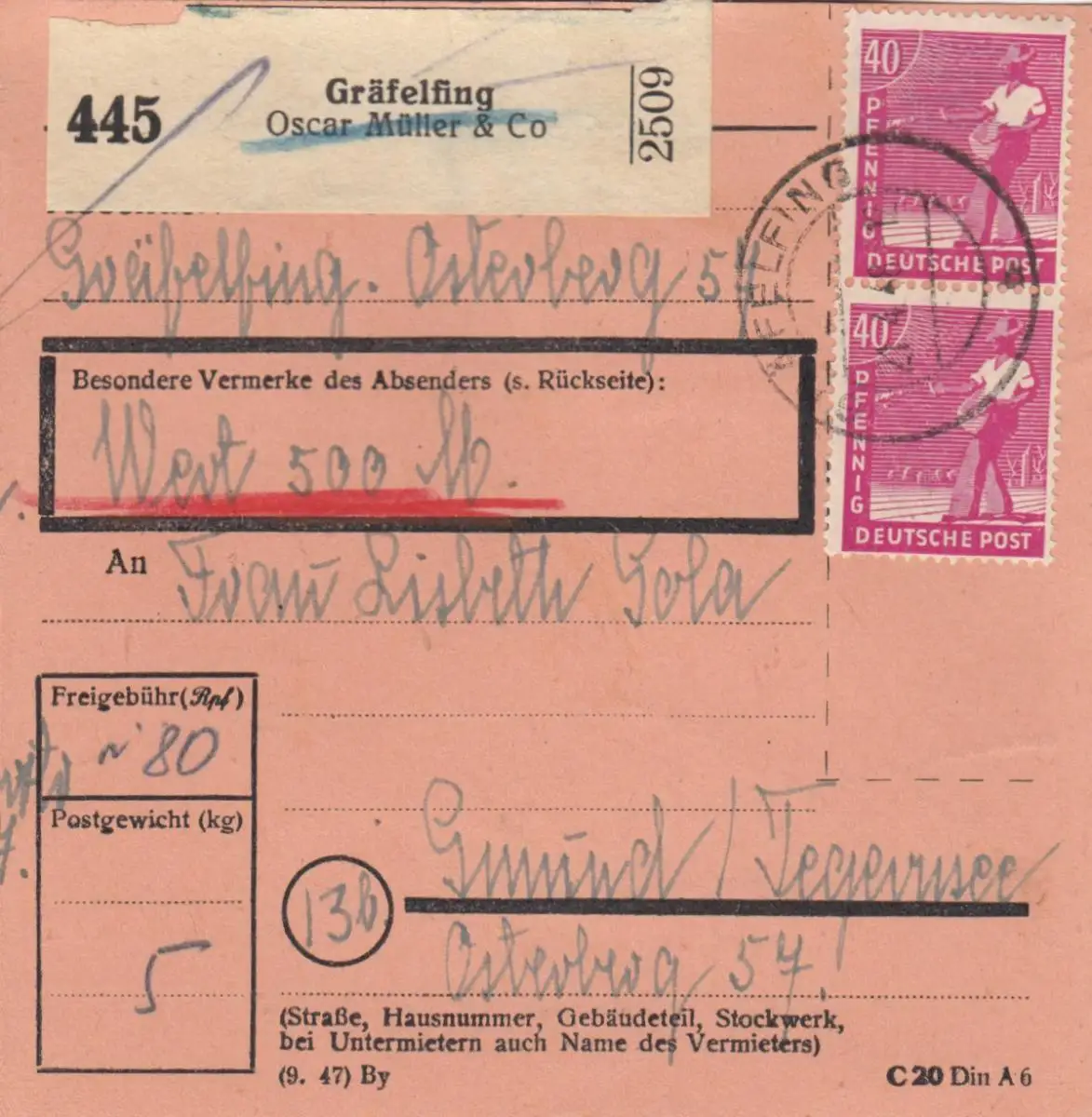 Carte de paquet 1948: Gräfeling, Oscar Müller Auto-booker, selon Gmund, valeur