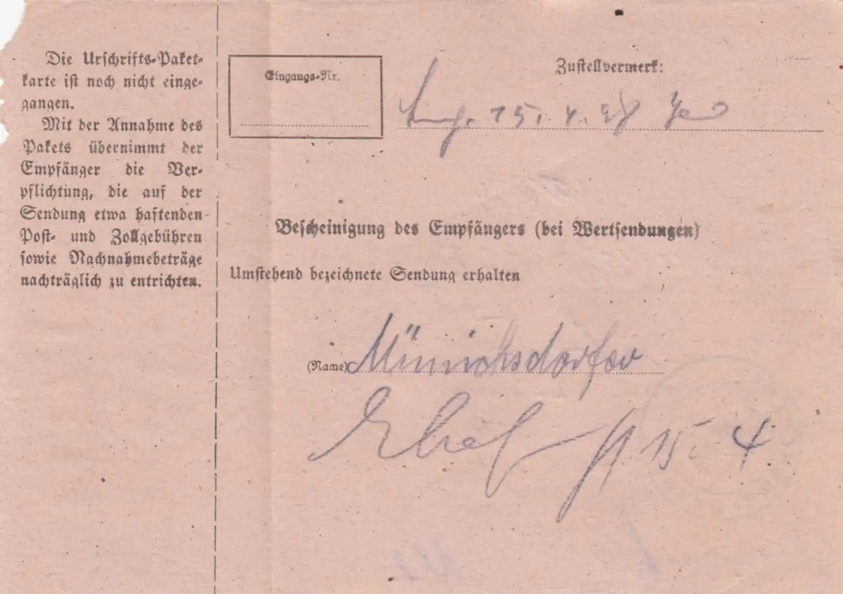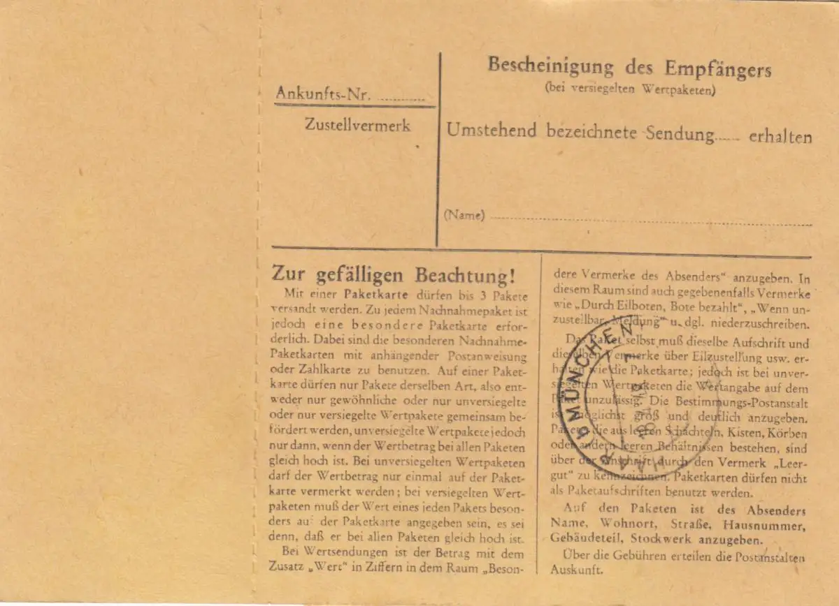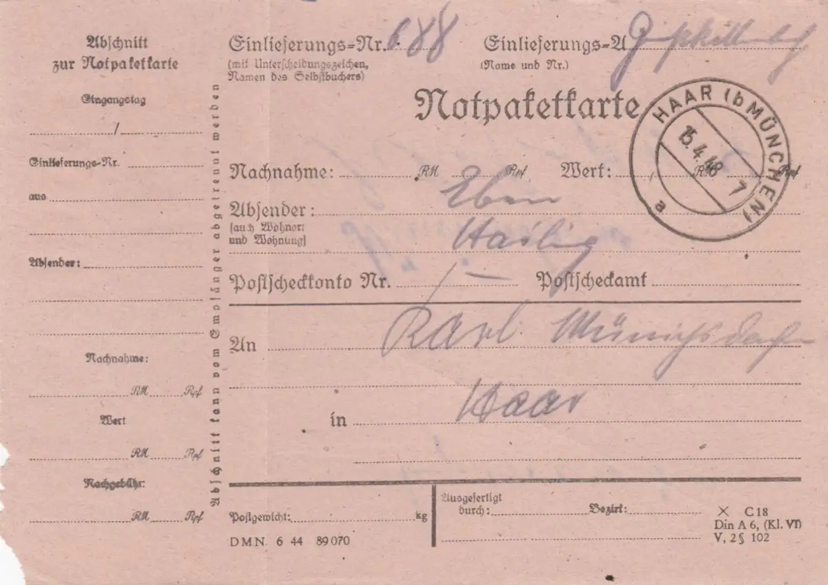 Carte de paquet 1948: Großköllnbach après Haar, avec carte de colis d'urgence