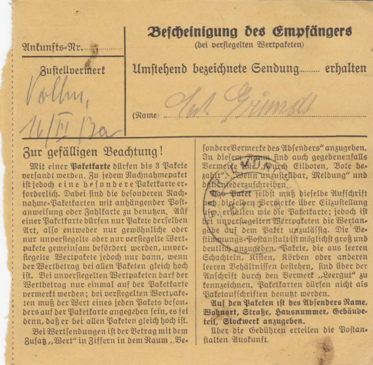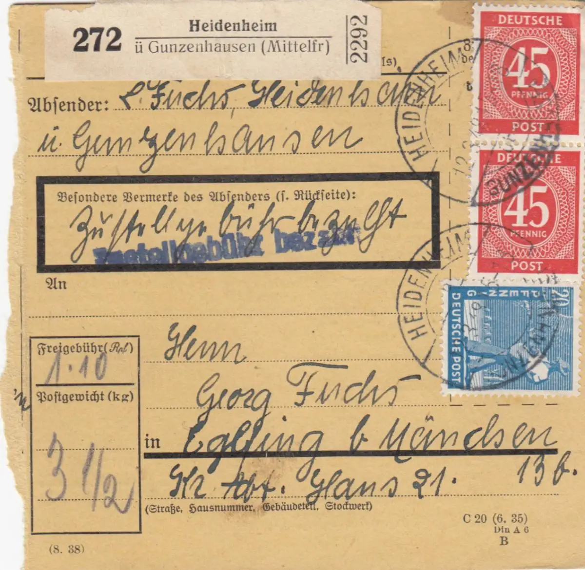 Carte de paquet 1948: Gunzenhausen vers Eglfing b.Munich