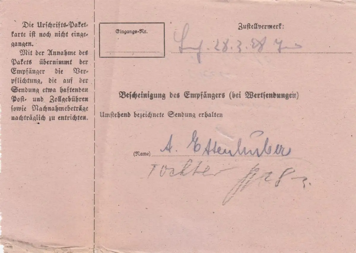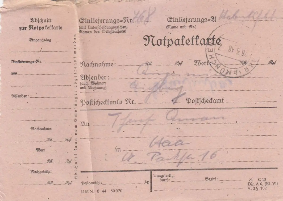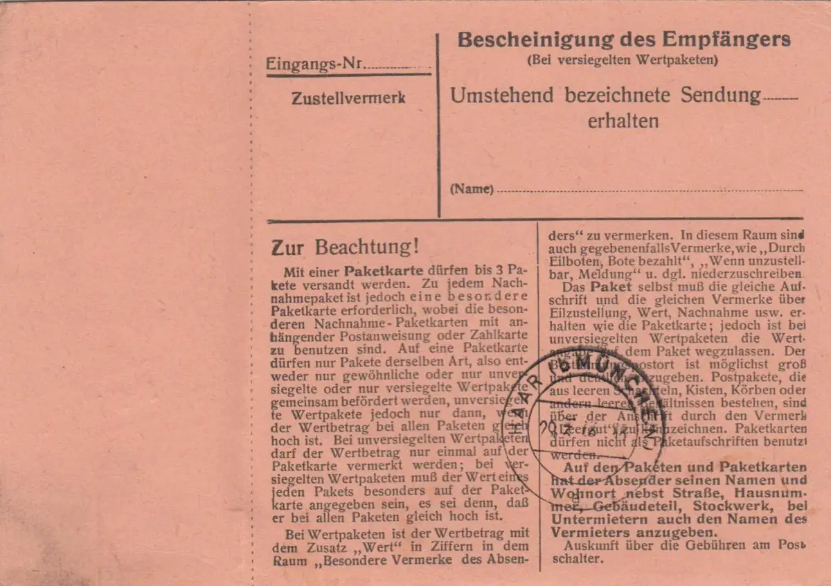 Carte de paquet 1948: Herbertsfelden par cheveux, avec carte de colis d'urgence