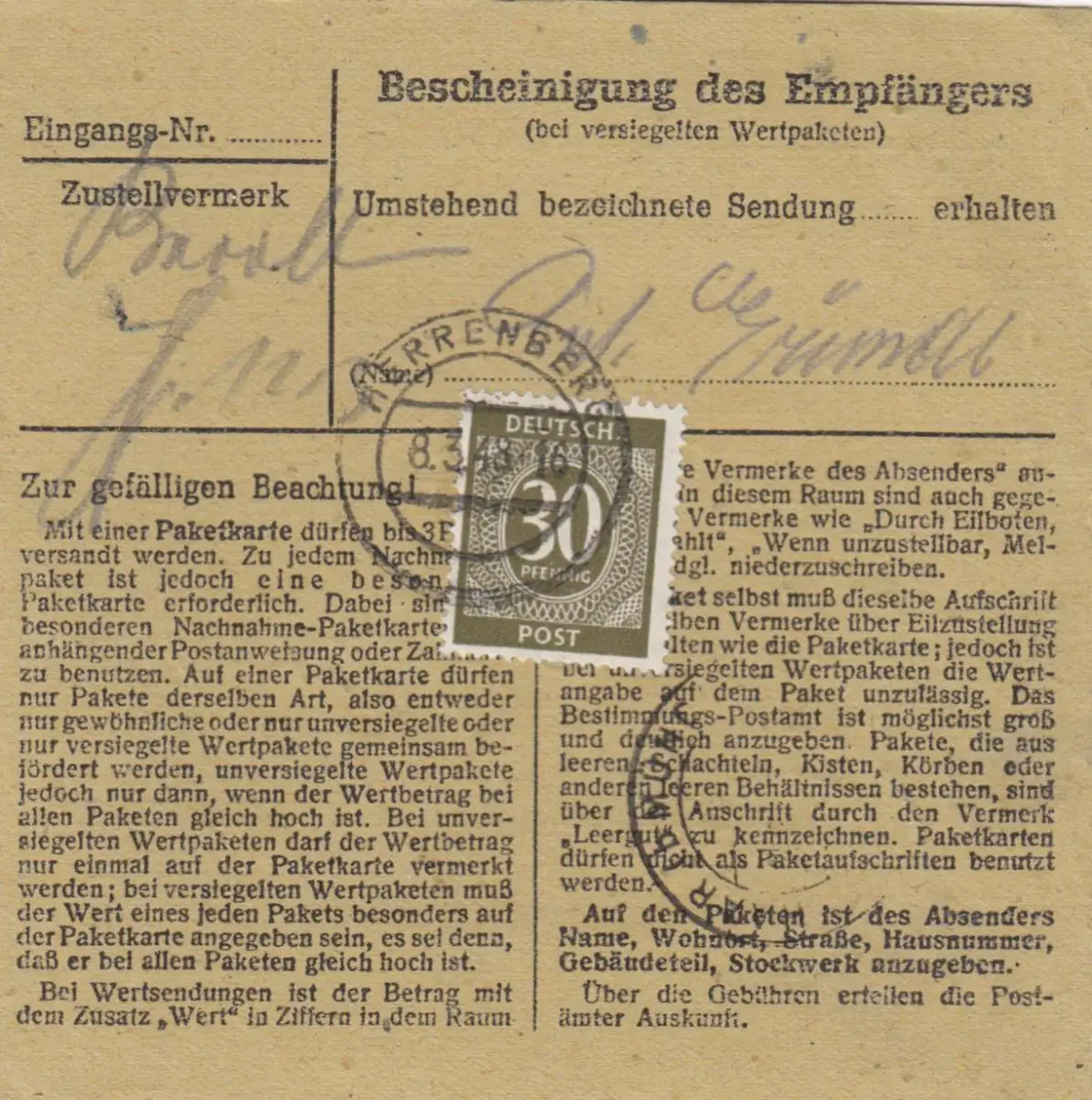 Carte de paquet 1948: Herrenberg après Haar, carte de valeur