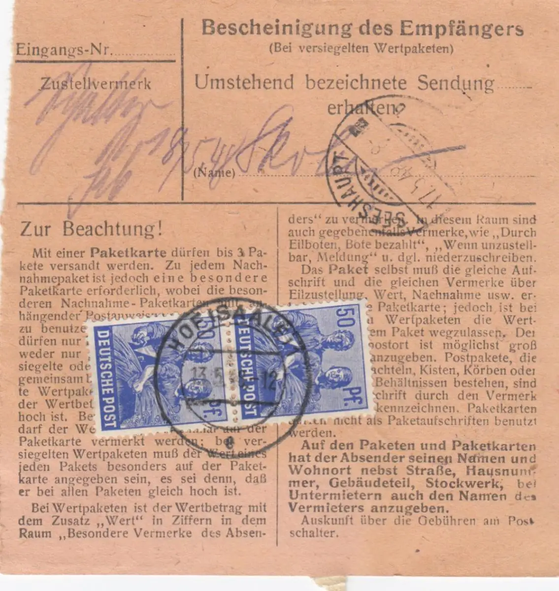 Carte de paquet 1948: Hof vers Bavaria GmbH in Seeshaft, carte de valeur