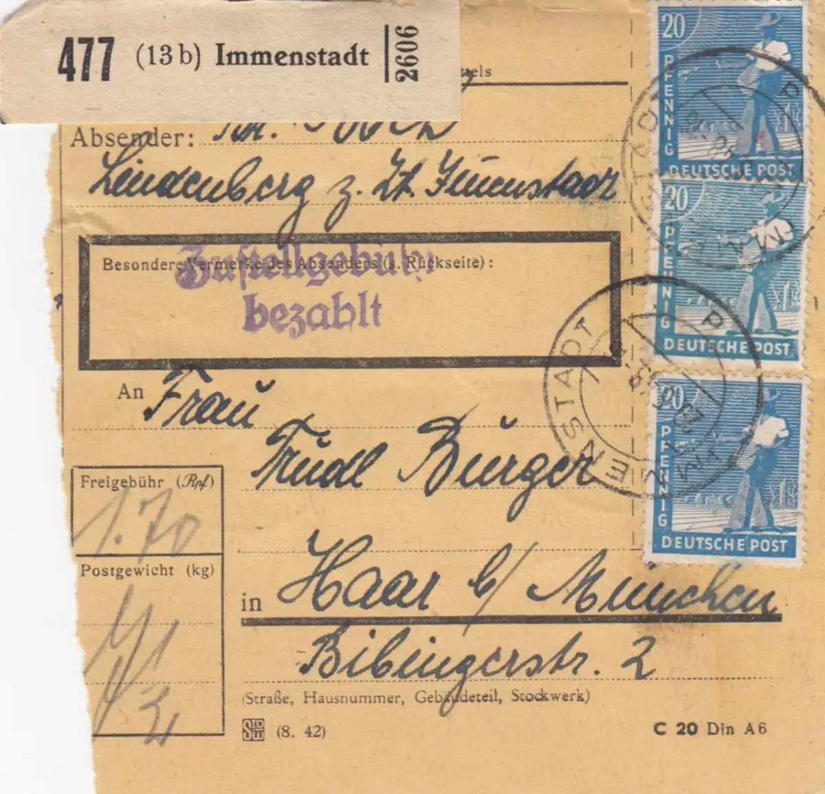 Carte de paquet 1948: Immenstadt après Haar - Munich