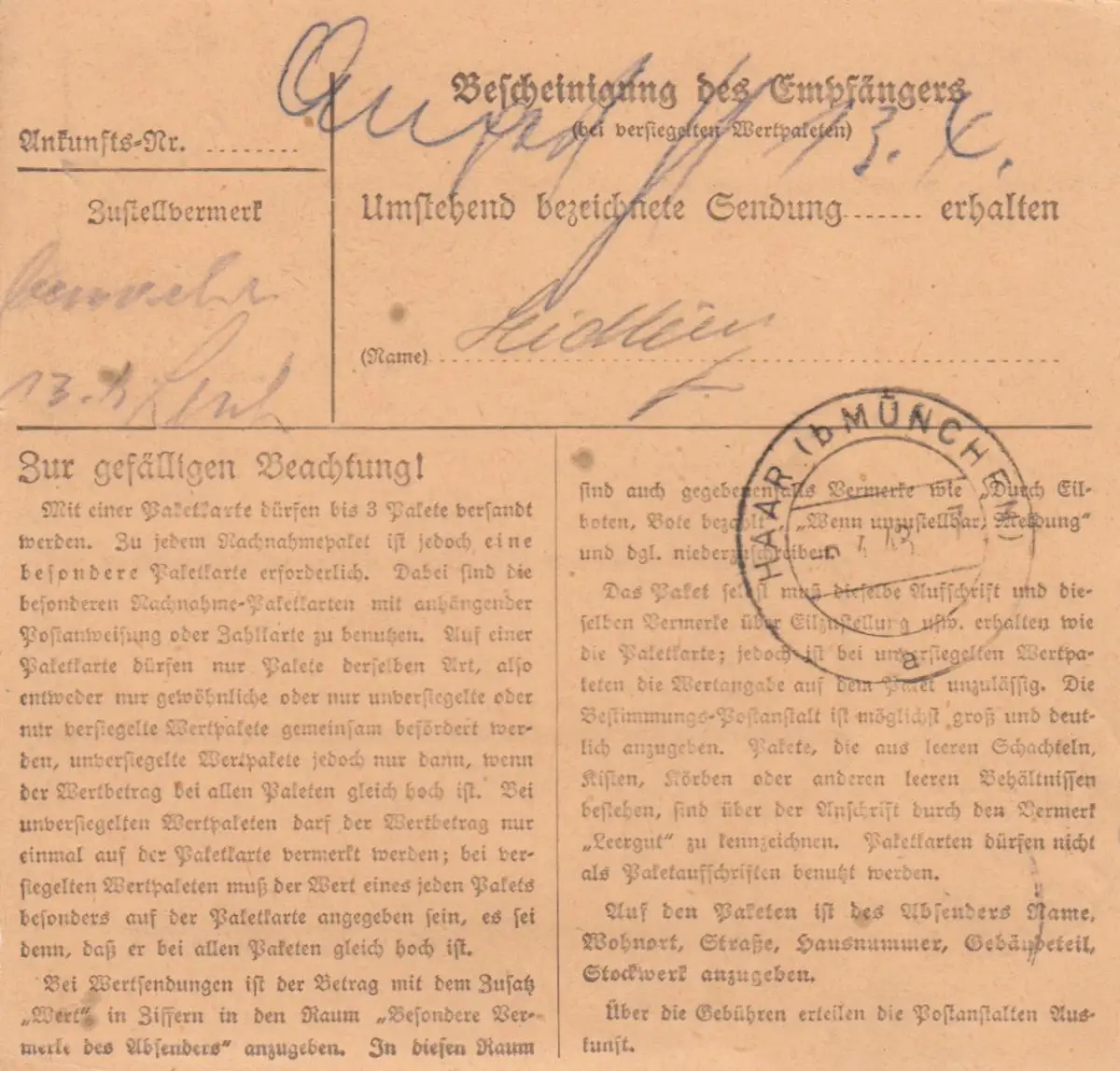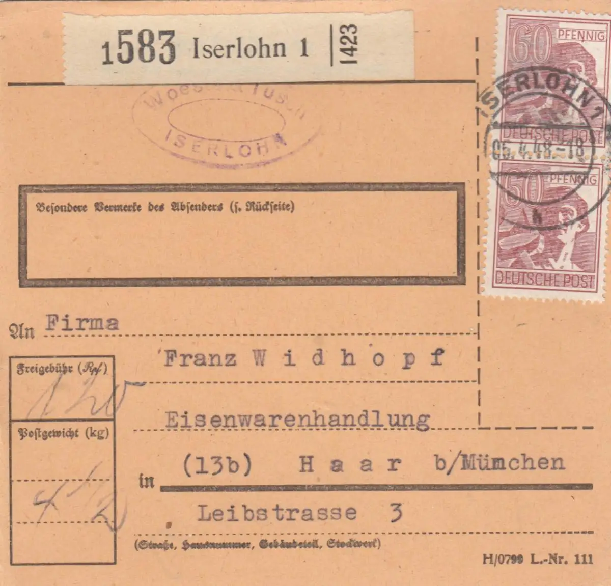 Carte de paquet 1948: salaire d'insertion après vente d 'une marchandise dans les cheveux