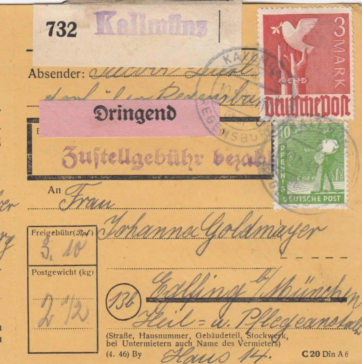 Carte de paquet 1948: pièce de monnaie à la main après Eglfing, établissement, urgent