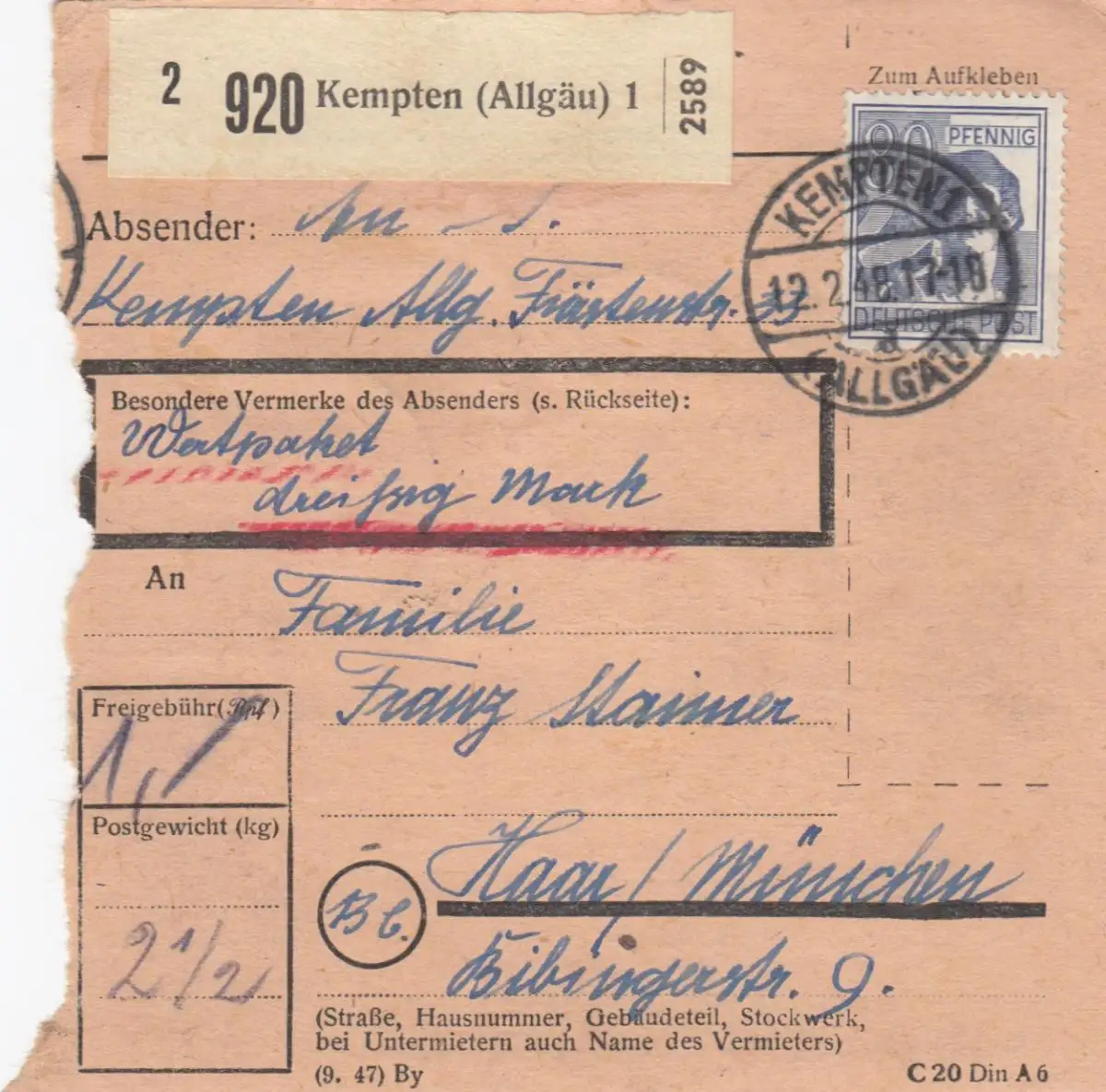 Carte de paquet 1948: Kempten Allgäu par cheveux, carte de valeur
