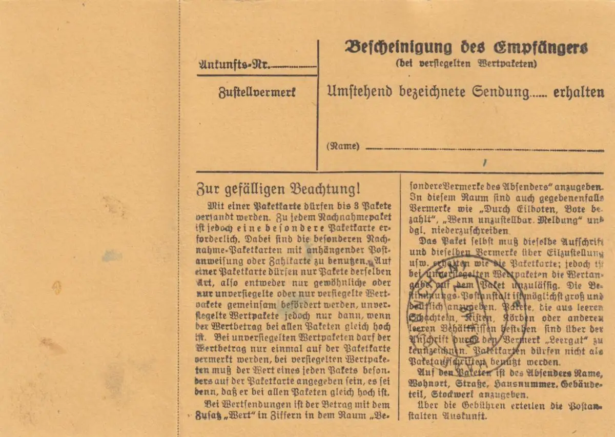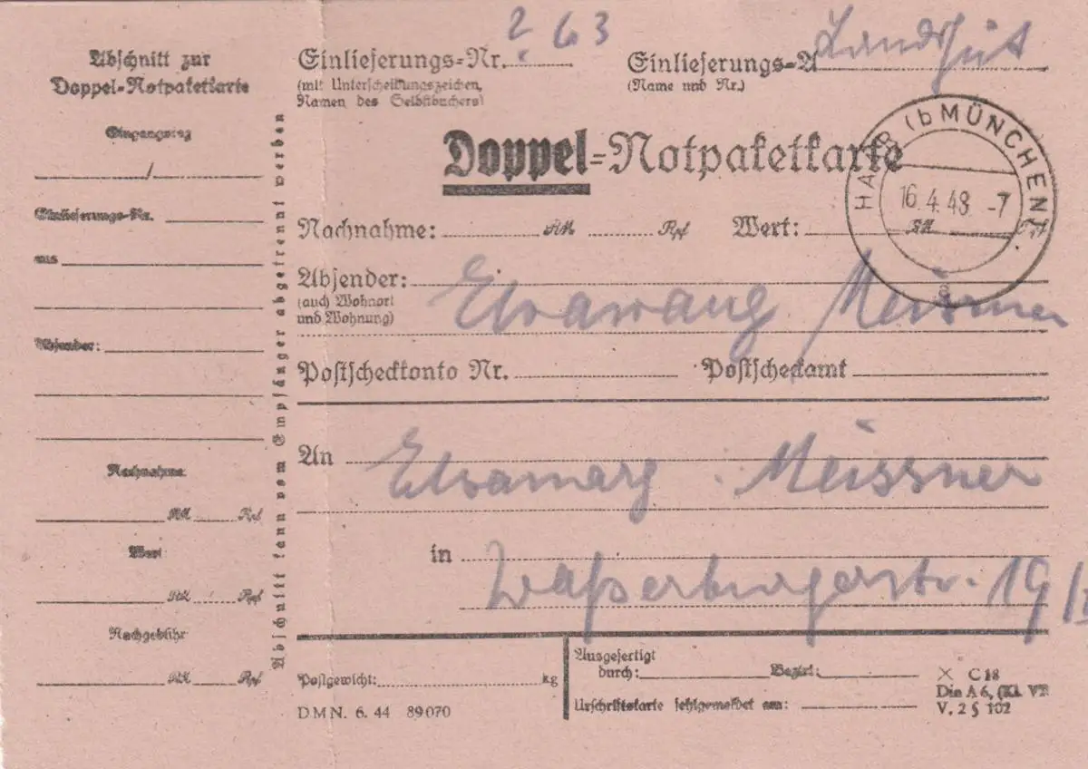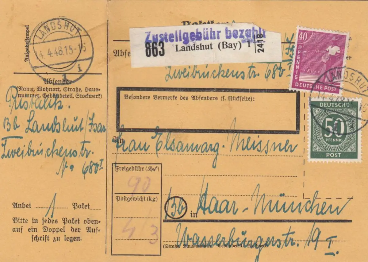Carte de paquet 1948: Landshut après cheveux, avec carte de package double
