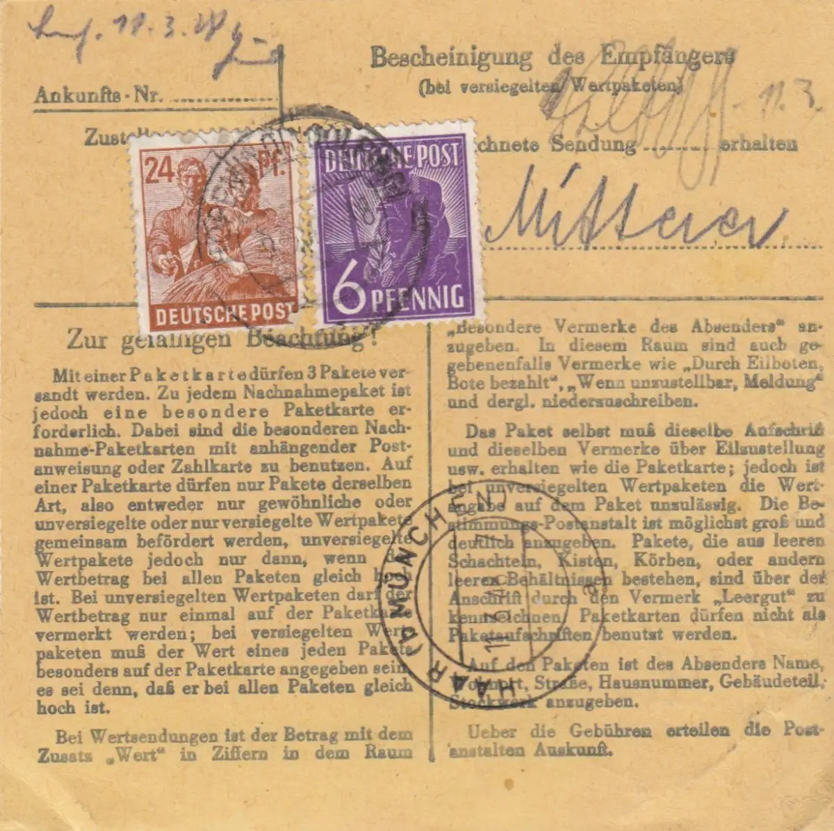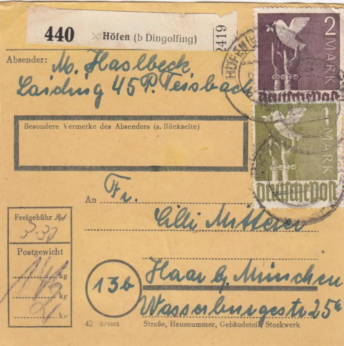 Carte de paquet 1948: La ferme de Loiching Teisbach par Haar
