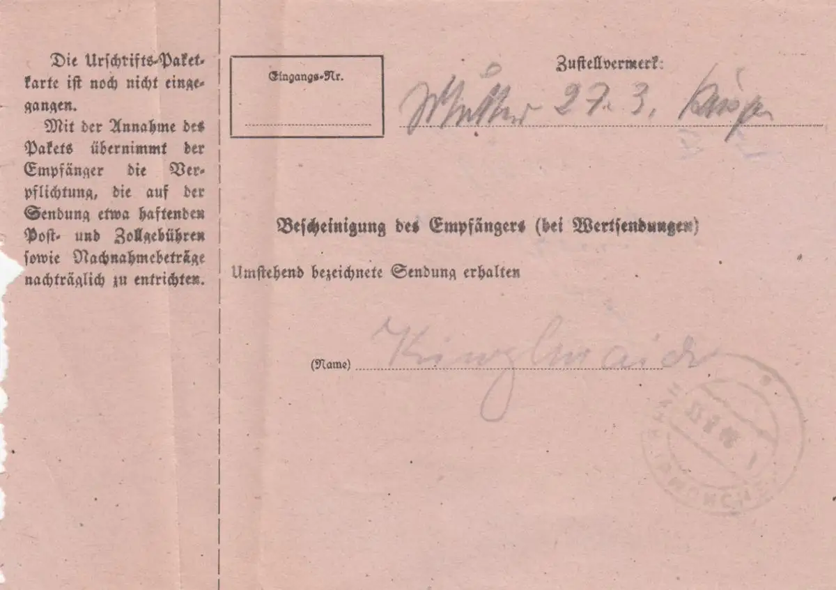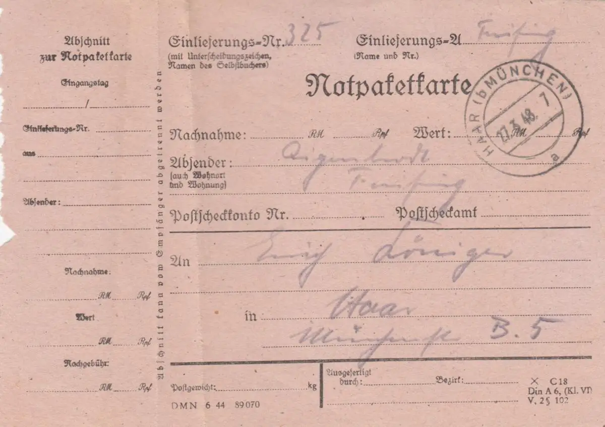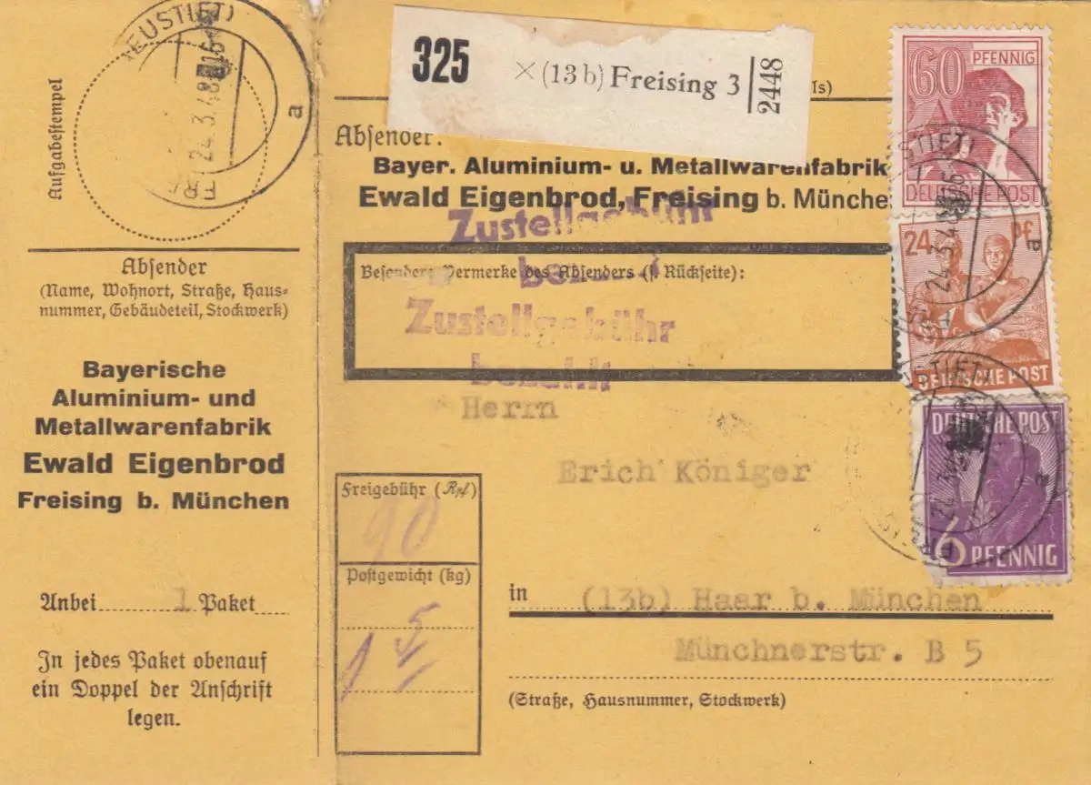 Carte de paquet 1948: Fabrique de produits métalliques Freising, Autob., avec carte de colis d'urgence