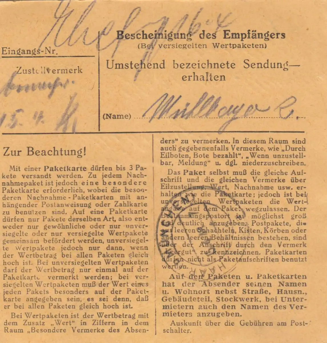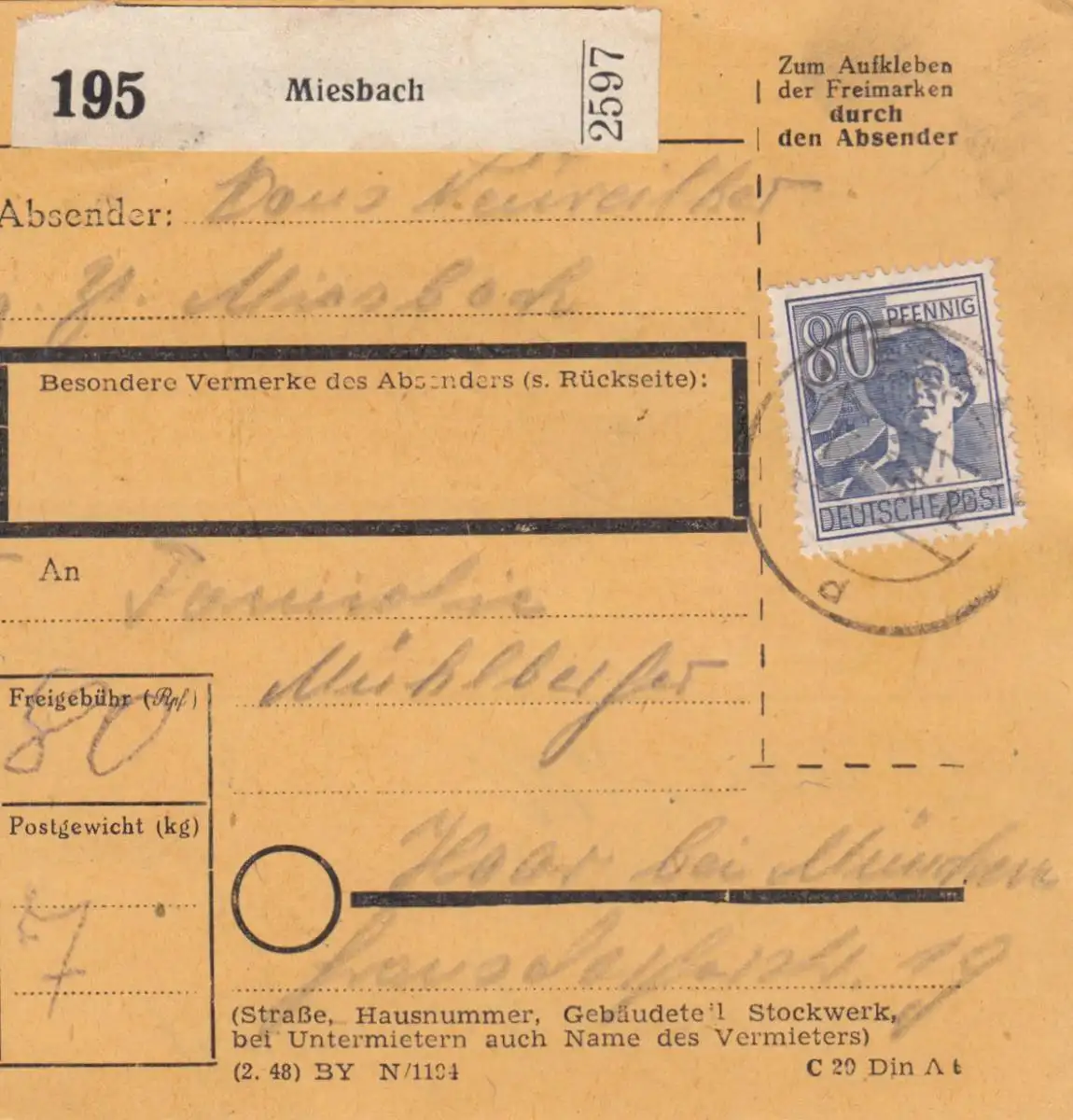 Carte de paquet 1948: Miesbach vers Haar bei Munich